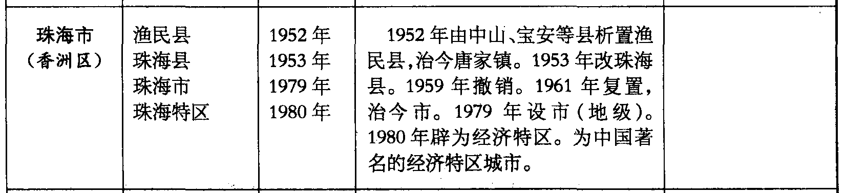 珠海市(香洲区)渔民县珠海县珠海市珠海特区1952年1953年1979年1980年1952年由中山、宝安等县析置渔民县,治今唐家镇。1953年改珠海县。1959年撤销。1961年复置,治今市。1979年设市(地级)。1980年辟为经济特区。为中国著名的经济特区城市。