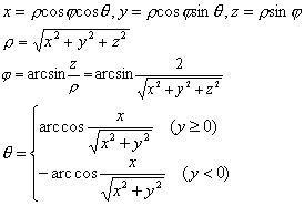 当一点的球坐标已知时,可由上述变换公式确定它的直角坐标; 反之当一点的直角坐标已知时,亦可用上述变换公式确定它的球坐标。但Z轴上点的球坐标不唯一确定。
