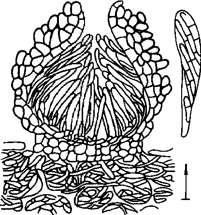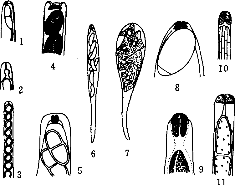 丛赤壳属[Nectria(Fr.)Fr.] 子囊壳丛生基物表面,或着生菌丝层上,或生于不发达的子座上,鲜红色或黄色,顶端具乳头状孔口;子囊棍棒形,内含8个子囊孢子,有顶生侧丝,子囊壳孢子双胞,无色。无性阶段常发生。主要在树木干、枝上引起干癌病或枝枯病,多数为腐生菌。本属已报道的200种,中国报道15种,常见种有:仁果干癌丛赤壳(N.galligenaBres.),无性态为苹果柱孢(Cylindrocarpon mali),寄生苹果、梨、茶、柳树等引起干癌病,也可引起幼枝和果枝枯萎病,并能危害花和果实;朱红丛赤壳[N.cinna-barina (Tode) Fr.],无性态为普通瘤座孢(Tllber-cularia vulgaris),为害苹果、无花果、茶、槭、榆、菩提树等,引起枝枯病。 丽赤壳属(Calonectria de Not.) 子囊壳丛生、表生,基部有菌丝层,红色、黄色或白色,球形至卵形;子囊圆筒形,含有8个子囊孢子;子囊孢子长圆形或纺锤形,多数由4个细胞组成,通常在子囊内芽殖。寄生多种植物引起根和叶部危害。本属已报道七种,中国报道四种。常见种有:禾生丽赤壳[C.graminicola(Berk.et Br.) Wollenw.],无性态为雪腐镰孢(F.nivale),寄生大麦、小麦、燕麦和黑麦等引起雪腐病。 黑痣菌属 (Phyllachora Nitschke et Fuckel)假子座发育于寄主组织内,子座顶部与寄主表皮层愈合为黑色光亮的盾状盖,子囊壳埋生盾状盖下假子座内,有孔口,子囊间有侧丝,子囊圆筒形,内含8个子囊孢子;子囊孢子椭圆形,单细胞,无色,寄生多种植物叶片引起黑痣病。本属已报道101种,中国报道60余种。常见种有:禾生黑痣菌(P. graminicola Saw.),寄生多种禾本科植物叶片,引起黑痣病。圆黑痣菌(P.orbicula Rehm),刚竹黑痣菌(P.phyllostachydisHara),中国黑痣菌(P.sinensis Sacc.),白井黑痣菌(P.shiraiana Syd),均寄生竹叶上引起黑痣病。 顶囊壳属(Gaeumannomyces V. Arx et Oli-vier) 子囊壳埋生寄主组织内,初内生后期外露,子囊壳球形或近球形,顶端有一圆筒形短喙、壳壁厚、深褐色;子囊圆筒形,内含8个子囊孢子;子囊孢子丝状、无色,有3~7个隔膜,成束平行排列于子囊内。寄生多种禾本科植物引起全蚀病,本属已报道4种,中国报道1种。禾顶囊壳[G.graminis (Sacc.) Arx et Oli-vier)、无性态是瓶霉属(Phialophora)。过去报道禾顶囊壳下分3个变种:小麦变种(G.graminis var. tri-tici)、水稻变种(G. graminis var.graminis)和燕麦变种(G. graminis var. avenae)。现从玉米全蚀病上又鉴定出玉米新变种(G. graminis var. maydis) 。 香柱菌属[Epichloe (Fr.) Tul.] 子座浅色,平铺状,包围禾本科植物茎和叶鞘上,类似鞘套,子囊壳埋生子座内,长卵圆形;子囊细长,单层壁,顶端加厚,具折光性的顶帽;子囊孢子丝状,无色,有隔膜。寄生多种禾本科牧草和杂草上,引起柱香病。本属已报道8种,中国报道5种。常见种有:香柱菌[E.typhina(Pers.) Tul.]无性态为禾香柱蜜孢霉[Sphaceliatyphina (Pers.) Sacc.]寄生于冰草属,纤毛鹅冠草属,雀麦属,早熟禾属等植物,引起香柱病。 麦角属(Claviceps Tul.) 侵染禾本科植物子房,后期在子房内形成圆柱形或香蕉形,黑色或白色菌核。菌核越冬后萌发产生子座,子座直立有柄,可育的头部近球形,子囊壳埋生整个可育的头部表层内。子囊细长,内含8个子囊孢子,子囊孢子丝状,无色,无隔膜。寄生禾本科植物花器引起麦角病。本属已报道35种,中国报道3种。常见种有:麦角菌[C.purpurea (Fr.)Tul.],无性态为麦角蜜孢霉(Sphacelia segetumLev.),寄生黑麦、大麦、小麦、冰草等多种禾本科植物花器,引起麦角病。麦角可药用,有止痛止血特效,人畜误食引起中毒。 虫草属[Cordyceps (Fr.) Link] 本属真菌多数寄生昆虫体内,某些种寄生蛛蜘,或大团囊菌的地下子实体内。自菌核上产生直立有柄的子座;子座棍棒形,图4虫草(冬虫夏草)[Cordyceps sinensis (Btrk.)Sace.]的虫体及子座(仿邓叔群)可育的头部膨大呈锣锤状;子囊壳埋生或半埋生子座内,卵形;子囊细长,内含8个子囊孢子;子囊孢子丝状,多隔膜,无色,在隔膜处断裂。本属已报道100种,中国报道26种。常见有: 虫草[C.sinensis (Berk.)Sacc.](冬虫夏草)尚无定无性态,已报道6个属; Hirsutellasinensis; Paecilomyces sinensis;Chrysosporium sinensis;Lypo-cladium sinensis; Scytalidiumhepiall; Stachybotrys sp. 寄生尺蠖幼虫体上,幼虫被害钻入土内虫体变为菌核,仍保持原来虫形,在土内越冬来年夏季自菌核生出有柄的子座,称为冬虫夏草(图4)。 图4 虫草(冬虫夏草)的虫体及子座(仿邓叔群) 座坚壳属(Rosellinia de Not.) 子囊壳球形,黑色,生于基物表面,硬而脆,常被菌丝层包围;子囊圆筒形,无色,内含8个子囊孢子;子囊孢子椭圆形或棱形,单胞,黑色或深褐色,具发芽缝。无性阶段属粘囊孢属(Graphium)。大多腐生,少数寄生。本属已报道的约100种,中国报道20种,常见种有:褐座坚壳[Rnecatrix (Hart.) Berl.],无性态为自纹羽束丝菌,寄生于苹果、梨、桃、李、杏、葡萄、马铃薯、蚕豆、大豆、芋、桑、茶等植物根部,引起白纹羽病。 炭角菌属(Xylaria Hill ex Schrenk) 子座直立,坚实,大形,分枝或不分枝,黑色,基部不育;子囊壳球形,埋生子座内;子囊圆筒形;内含8个子囊孢子,有侧丝;子囊孢子椭圆形,单胞,黑色。本属是一个大属,已报道约100种,中国报道54种。主要生于腐木和木材上。常见种有果生炭角菌[X.carpophila (Pers.)Fr.],生于枫香的落果上。 囊孢壳属(Physalospora Niessl) 子囊壳球形,黑褐色、具短颈或乳头状孔口,无子座,埋生寄主组织内,后突破寄主表皮露出孔口;子囊棍棒形,内含子囊孢子8个;子囊孢子椭圆形,卵形或纺锤形,单胞、无色或鲜色。本属已报道30种,