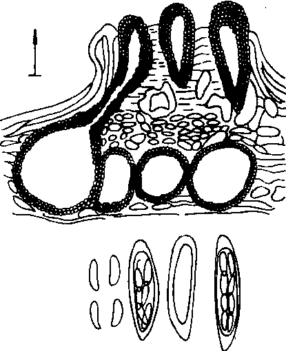 子囊一般含有8个孢子。子囊孢子椭圆形,腊肠形,洋梨形或柠檬形,有色或无色,单胞或多胞,表面光滑或有纹饰,有的孢子还具有发芽孔或发芽缝,或有附属丝。 分生孢子 球壳目的大多种生活史中有分生孢子和(或)无性孢子阶段,主要属于丛丝孢纲,少数属于腔孢纲真菌。分生孢子多为芽生分生孢子,有色或无色,单胞或多胞,圆形至长形。球壳目真菌分生孢子阶段为常见,寄生的在其寄生阶段只产生分生孢子,至腐生阶段才形成子囊孢子。 分类 球壳目分科的主要依据是小囊形态。特别是子囊顶端形态和子囊壁在子囊孢子成熟前是否消解,其次是子囊孢子的形态,大小,结构和颜色以及芽孔或芽缝的有无。包被组织,子座的发育和形态、分生孢子阶段的形成等。广义的球壳目包括15科,即:海壳科(Halosphaeriaceae)、黑孢壳科(Melanospo-raceae)、长喙壳科(Ophiostomataceae)、棒囊菌科(Coryneliaceae)、瓶口衣科(Verrucariaceae)、粪壳科(Sordariaceae)、疔座霉科、肉座菌科 (Hypo-creaceae)、球壳科 (Sphaeriaceae)、间 座壳 科(Diaporthaceae),疣孢壳科(Hypomycetaceae)、麦角菌科(Clavicipitaceae)、蕉孢壳科(Diatrypaceae)、炭角菌科(Xylariaceae)、圆孔壳科 (Amphispha-eriaceae)。 1983年英国人霍克斯沃恩(David L. Hawk-sworth)等《真菌辞典》第7板(Dictionary of theFungi)里,球壳目下圆孔壳科,海壳科,假毛球壳科,炭角菌科4科,共225属,1275种。球壳目重要属如下。 长喙壳属(Ceratocystis Ell. et Halst.) 子囊壳基部膨大或球形,有细长的颈,顶端常裂成须状,壳壁暗色;子囊壁在子囊孢子发育早期消解;子囊孢子单胞,无色,小型,形状多样,有椭圆形,蚕豆型,帽型,四角形或针型。由于子囊壁早期消解,子囊孢子在子囊壳粘液内游离,成熟时子囊壳吸水产生压力,混在粘液中的子囊孢子沿长颈被格出,在孔口毛之间形成孢子团有利昆虫传播。有些种是同宗配合,也有的是异宗配合。无性繁殖产生各种类型的分生孢子,分别属于半知菌的粘囊孢属(Graphium),细粘囊孢属(Leptographium),内梗霉属(Endoconidiophora),内孢霉属(Gralara),头孢霉属(Cephalosporium)和根串球霉属(Thielaviopsis)等。本属已报道80余种。中国报道有3种。常见种有引起甘薯黑斑病的甘薯长喙壳(C.fimbriata Ell. et Halst.);引起甘蔗凤梨病和菠萝基茎腐病的奇异长喙壳〔C.paradoxa (Dade)Mor.〕。 小丛壳属(Glomerella Schrenk et Spaulding)子囊壳埋生寄主组织内,小形,球形至烧瓶形,散生或群集,深褐色,膜质,有喙;子囊棍棒型,内含8个子囊孢子;子囊孢子单胞,无色,长圆形至椭圆形,常无侧丝。无性态为炭疽菌属,能引起多种作物炭疽病。中国报道7种,常规种有围小丛壳[Glomerella cingula-ta (Stonem.) Spauld. et Schrenk],无性态为胶孢炭疽菌(Colletotrichum gloeosporioides),能为害苹果、梨、山楂、桃、葡萄、柑桔、枣、柿、板栗、无花果、香木瓜、橄榄、杧果、鳄梨、番茄、冬青、茶、咖啡等植物的叶片、果实和枝条,引起炭疽病;瓜类小丛壳[G.lagenarium(Pass.) Stev.],无性态为瓜类炭疽菌(Colletotrichumlagenarium),寄生于瓜类,引起炭疽病。 黑腐皮壳属(Valsa Fr.) 子囊壳球形或近球形,具长颈,成群深埋寄主组织假子座内,通常轮状排列,子囊壳颈聚集,向外露出孔口。假子座与寄主组织间无明显界限;子囊棍棒形或圆筒形,内含8个子囊孢子;子囊孢子单细胞,无色或稍带褐色,图2苹果黑腐皮壳(Valsa mali)的子囊壳,子囊和子囊孢子(戚佩坤,白金铠),弯曲呈香蕉形(图2)。无性态为壳囊孢属(Cytospora)。主要为害木本植物的树皮,引起树干的腐烂病,是弱寄生菌。本属已报道60种,中国报道10种。常见种有苹果黑腐皮壳(V.mali Miyabe et Yama-da),寄生苹果、花红、海棠引起腐烂病; 梨黑皮壳[V.ambiens(Pers.) Fr.]寄生于梨引起腐烂病;日本黑腐皮 壳 (V.japonicaMiyabe et Hemmi),寄生桃、李、杏、梅、樱桃等,引起腐烂病。