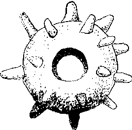 朵兵器。1985年7 月黑龙江省五常县长山乡金代窖藏出土。上半部有2周刺,上层7个,下层9个,中心上下通孔,孔直径2厘米。现已横断为二半。使用时按长柄,为女真人的独特兵器或仪仗礼器。