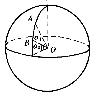 例 已知A地位于北纬30°,东经60°,B地位于北纬60°,东经90°,求A,B两地的球面距离. 解 这里α1=30°,α2=60°,β1=60°,β2=90°,由上面的公式得 使用上面的公式时,应注意北纬与南纬,西经与东经是具有相反意义的量,我们规定北纬与东经的度数为正,南纬与西经的度数为负. ☚ 球面上两点间的距离 球冠 ☛ |