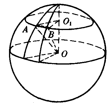 图2 ❷纬度相同,经度不同 设A,B的纬度都是北(南)纬α度,而它们的经度分别为东经β1和β2度,球半径为R,则A,B两点的球面距离为过A,B两点的大圆的劣弧 ![]() O1A=OAcos∠O1AO=