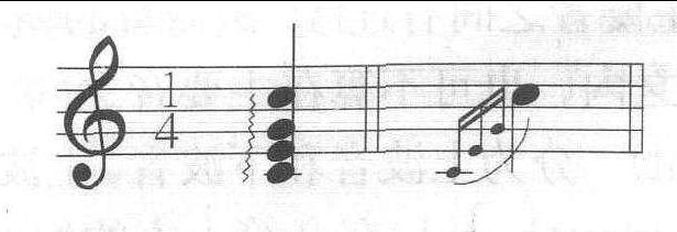 指用以表示和弦中的各音不是同时,而是快速地依次奏出的符号。其标记是记在和弦前边的竖曲线。有时琶音的奏法如短倚音的记法和奏法。例: