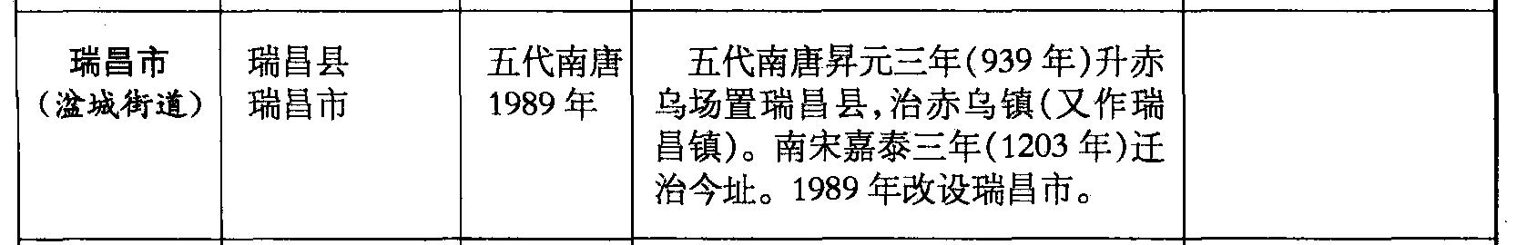 瑞昌市(湓城街道)瑞昌县瑞昌市五代南唐1989年五代南唐昇元三年(939年)升赤乌场置瑞昌县,治赤乌镇(又作瑞昌镇)。南宋嘉泰三年(1203年)迁治今址。1989年改设瑞昌市。