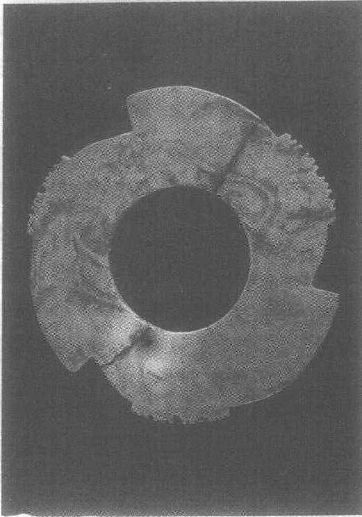 释义 | 璇玑形玉环状器 璇玑形玉环状器铜石并用时代龙山文化。直径8厘米。1978年山东省滕县里庄出土。山东省滕县博物馆藏。此器出土时断成两块,现已粘合复原。其形制奇特。似一变形环。周边有三个向同一方向旋转的凸棱,每一凸棱间各有一组小锯齿样的凸起。每组凸起有12枚,每三枚又分为一小组。这种器物以前多定为商或西周,近年在山东、河南、陕西等地的龙山文化遗址中皆有发现,从而使它的断代提前到新石器时代。其形状不尽相同,有三、四、五数量不等的凸棱,有的带小齿,有的则不带。吴大澂《古玉图考》称它为“璿玑”,认为是天文仪上的一个零件,后代学者多从其说。但夏鼐先生经考证后否定了此说。此物的真正用途目前尚无法确定,名称也只是暂定。有些旧藏物已流于海外,台湾也藏有此物。因上面有戚齿,台湾的文物工作者将它称为“戚璧”。龙山文化见“黑陶鼎”条目。 ☚ 人面形玉饰 兽面纹玉锛 ☛ |