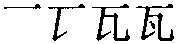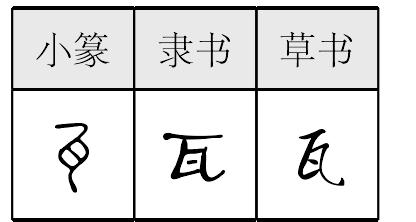 ❹ 寸椽片瓦|根椽片瓦|加砖添瓦|添砖加瓦|朱楼碧瓦 瓦 金文; 篆wǎ[象形。(《説文》:“瓦,土器已燒之總名。象形。”“瓦”是“互”的指事字。瓦是用半圓形土坯經窑燒制而成。蓋瓦時正反相間放置,凹面向上者在屋面上形成“溝”,承接雨水,雨水順檐口下滴。“瓦”字象形。瓦,泛指用土坯燒製成的器皿〈瓦盆,瓦罐〉。古代的紡錘〈瓦〉,古人生了女孩叫“弄瓦”,就是説她長大後主要是“紡紗織布”。比喻崩潰分裂〈土崩瓦解〉,就像互相搭在一起的瓦散了開來。)] 《詩經·小雅·斯干》:“乃生女子,……載弄之瓦。”(若是生個小姑娘,……就把紡錘給她玩。) [西漢] 司馬遷 《史記·秦始皇本紀》:“秦之積衰,天下土崩瓦解。”(秦的衰敗是世代積累而成,天下早已分崩離析。) 瓦(wǎ)“ ,土器已烧之总名。象形。凡瓦之属皆从瓦。”(五寡切) 段玉裁注:“凡土器,未烧之素皆谓之坏,已烧皆谓之瓦。……(象形也)象卷曲之状。”张舜徽云:“土器之已烧者,品类至繁,不可胜状,惟举屋瓦以概其余耳。此文盖本作 ,象屋瓦一仰一伏形。其后为便书写,乃易横为直。篆体首笔横出以作笔势,中又加一以承其虚,而象形之旨渐晦。”[1] 睡虎地秦简作 。小篆“瓦”尚象屋瓦相互勾搭之形;构意为瓦片,实义为陶器总称。《楚辞·卜居》:“黄钟毁弃,瓦釜雷鸣。”《韩非子·外储说右上》:“有瓦器而不漏,可以盛酒乎?”其中瓦都是泛指陶器。今“瓦”特指盖房用的瓦片。北京卖土器的店铺叫“缸瓦铺”或“瓦铺子”,用了“瓦”之初义。 瓦部有二十四个属字,本义多与烧制土器的匠工或所烧制的土器、瓦片等有关。如“甄”字下云:“匋也。从瓦,垔声。”又如“甍”字下云:“屋栋也。从瓦,夢省声。”“ ”字下云:“小盂也。从瓦,夗声。”扬雄《方言》作“盌”,今通行碗、椀字。 瓦(4画) ❶wǎ ❷wà