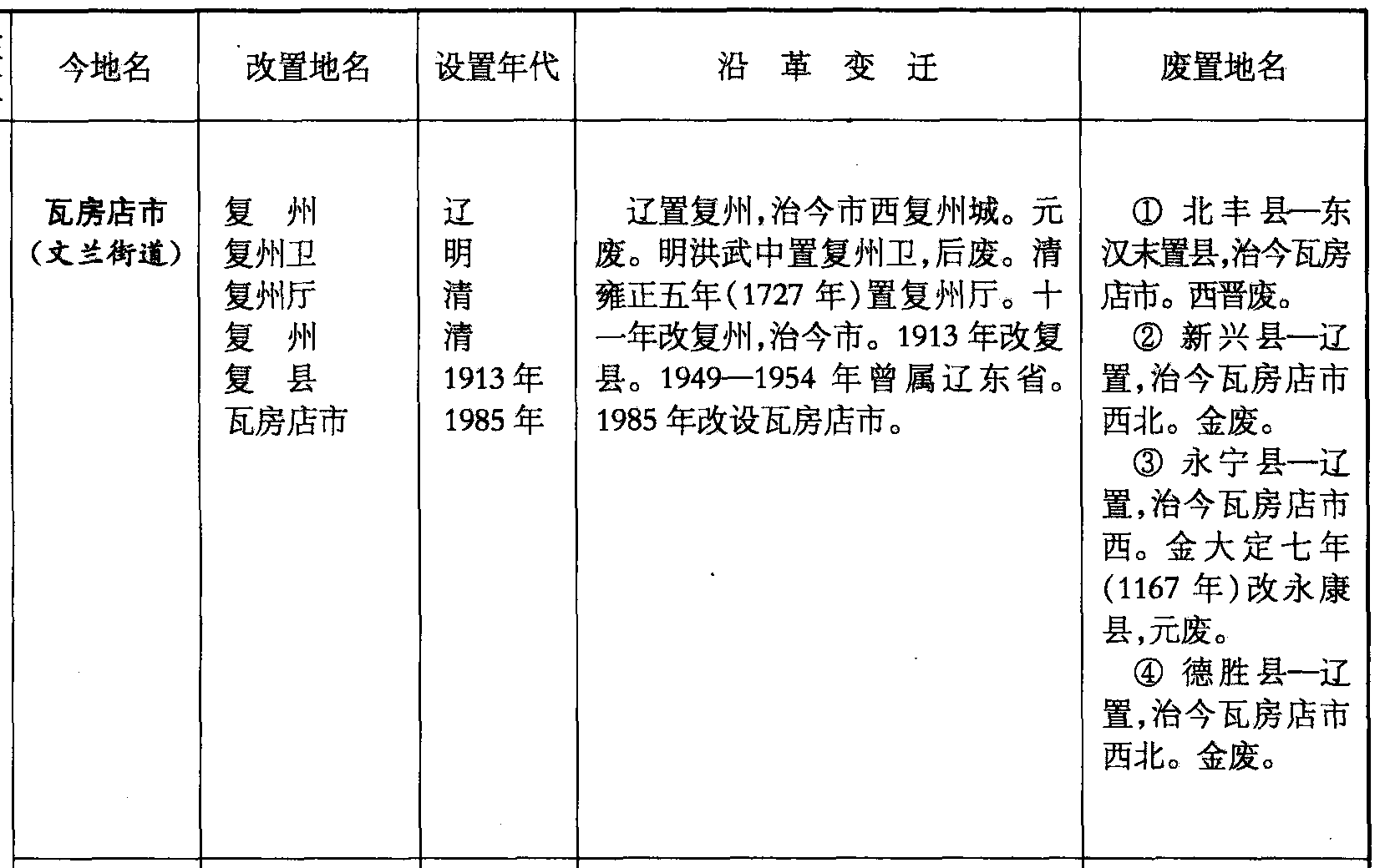 瓦房店市(文兰街道)复州复州卫复州厅复州复县瓦房店市辽明清清1913年1985年辽置复州,治今市西复州城。元废。明洪武中置复州卫,后废。清雍正五年(1727年)置复州厅。十一年改复州,治今市。1913年改复县。1949—1954年曾属辽东省。1985年改设瓦房店市。❶ 北丰县—东汉末置县,治今瓦房店市。西晋废。❷ 新兴县—辽置,治今瓦房店市西北。金废。❸ 永宁县—辽置,治今瓦房店市西。金大定七年(1167年)改永康县,元废。❹ 德胜县—辽置,治今瓦房店市西北。金废。
