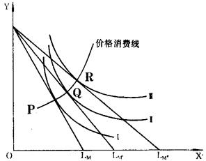 当一种商品价格发生变化时,例如,当商品X的价格变化时,首先会改变消费者的预算线,使预算线的斜率变化。 新的预算线同较高的无差异曲线相切,就会形成新的最大效用均衡点。若商品X的价格连续下降,便使消费者的预算线连续降低,这些新的预算线依次同较高水平的无差异曲线相切,从而形成一系列连续的最大效用均衡点,这就是成了价格——消费线。如图所示,当预算线为LM时,LM与无差异曲线Ⅰ在P点相切形成最大效用均衡;当商品X的价格下降使预算线变为LM′时,LM′与无差异曲线Ⅱ在Q点相切,形成新的最大效用均衡;当商品X的价格进一步下降使预算线变为LM″时,LM″与无差异曲线Ⅲ在R点相切,再次形成最大效用均衡。图中的价格消费曲线就是所有这些最大效用均衡点的连线。  因此,确切地说,价格——消费线就是商品坐标平面上表明在货币收入不变的情况下由于商品的价格比率发生变化而形成的均衡的商品组合点的集合。 |