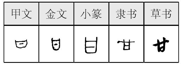 【提示】中间一横宋体与两边相接,楷体与左边相接,与右边相离。 *甘gān5画 甘部 (1) 甜(与“苦”相对): ~甜|~苦|~泉|苦尽~来。 (2) 美好;令人满意的: ~雨|~霖。 (3) 以为甘美;引申为情愿;乐意: 食不~味|~贫乐道|~拜下风|心~情愿|不~失败|~当小学生。 (4) 甘肃的简称: 陕~宁地区。 甘 ☚ 甘部 猒 ☛ 甘gān甲骨文、金文到小篆的指事字。从口中含“一”。口字原来是器形,与“皿”通。后来多作口舌的口讲,认为是可口的美味。甲骨文和西周金文在偏旁中甘与口常通用,如旨、鲁、者、尝(嘗)等字的下部从口或从甘。美味,好义。如:甘苦|甘泉|同甘共苦。又比喻美好。如:甘雨。引申为甘心,自愿,乐意。如:甘心情愿|不甘失败。 甘★常◎常