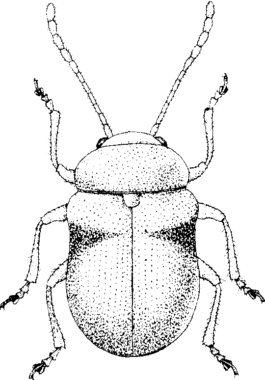 甘薯叶甲sweet potato leaf beetleColasposoma dauricum auripenne Motschulsky,又称甘薯叶甲丽鞘亚种。昆虫纲,鞘翅目,肖叶甲科。分布于华南、西南及华东;日本、印度、东南亚也有分布。寄主有甘薯、蕹菜、牵牛花、小旋花。成虫体长约6 mm,短椭圆形,体色多变,有青铜色、蓝色、绿色、蓝紫色、蓝黑色等,具金属光泽;触角11节,端部5节稍膨大;鞘翅多红铜色,肩胛下方有一闪蓝色光泽的三角形斑,外侧肩胛后方短脊状褶皱粗而高隆;前胸背板、鞘翅和小盾片基部刻点粗密。末龄幼虫体长9~10 mm,黄白色,体粗肥,多横皱褶并密被细毛,弯曲呈“C”形。一年发生1代,以幼虫在深土中越冬。成虫喜食薯苗嫩头,常使顶尖折断,幼苗枯死,卵产于禾本科杂草和豆类植物的枯茎中、枯萎的薯蔓中及薯苗根际处。幼虫孵化后很快入土,食害须根及薯块表皮,被害薯块呈麻点状,或蛀食薯块,形成弯曲隧道。防治方法是:铲除杂草,清洁田园,杜绝成虫取食和产卵;利用成虫假死性进行捕捉;薯苗扦插前用药液浸苗;降雨后成虫激增期喷洒农药。 |