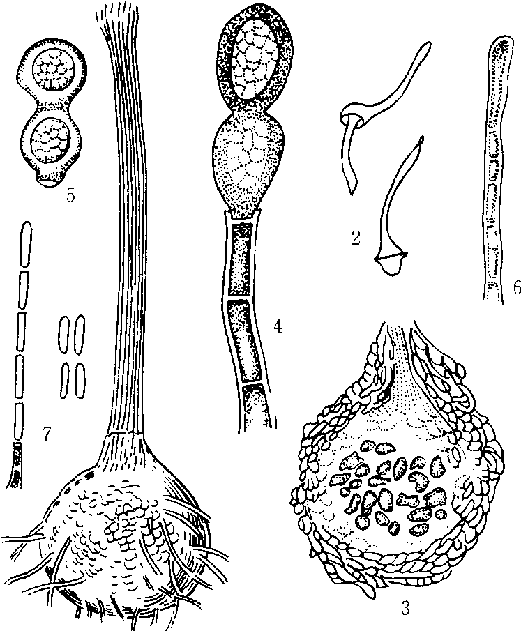 病菌在培养基上的生长温度,最低为9~10℃,最高为34.5~36℃,最适为25~30℃。病菌接种于薯块,14℃时易生厚垣孢子,23℃则易产生子囊壳。生长的pH范围为3.7~9.2,最适为6.6。培养基中加入低浓度的维生素B1,有助于生长和促进子囊壳的产生。三种孢子如在薯块伤损处或1%蔗糖液中,萌发率较高。 甘薯黑斑病发生轻重与温湿度、土质、耕作制度、甘薯品种和薯块伤口、虫鼠为害状况等有密切关系。甘薯受病菌侵染后,土温在15~30℃之间均能发病,最适温度为25℃。甘薯贮藏期间,最适发病温度为23~27℃,10~14℃较轻,15℃以上有利于发病,35℃抑制发病。土壤含水量在14%~60%时,病害随湿度的增高而加重,超过60%,又随湿度的增加而递减。一般地势低洼、土质粘重的地块发病重,地势高燥、土质疏松的发病轻。连作田的甘薯发病较重,春薯发病比夏、秋薯重,薯块裂口多或虫、鼠为害有伤口的薯块,病害也相应加重。目前甘薯对黑斑病尚无免疫品种,但品种间抗病性有差异,薯块易发生裂口的或薯皮较薄易破损,伤口愈合速度较慢的品种,发病较重,济薯7号、南京92、华东51、夹沟大紫、烟薯6号等品种(系),抗病性较强。 甘薯黑斑病菌在自然情况下的主要寄主为甘薯,人工接种能侵染月光花、牵牛花、绿豆、豇豆、四季豆、大豆、橡胶树、椰子、可可和菠萝等植物。 侵染过程和病害循环 病菌以厚垣孢子、子囊孢子或菌丝体在薯块或茎蔓上越冬。据测定在室温5℃以上干燥条件下,厚垣孢子和子囊孢子均可存活150天,在水中,子囊孢子可存活148天,厚垣孢子可达128天。病菌在田间土壤内能存活两年零九个月。病害传播途径,即种薯种苗、土壤肥料和人畜携带。利用带病种薯育苗,在苗床上即产生病苗,病苗又侵染健苗,病苗栽植田间后,进而污染土壤。用病土育苗、垫圈,均可造成苗床和肥料带菌传病。土壤带菌主要来自病残体和带菌肥料。在甘薯收获、贮藏时,病菌可藉人畜、昆虫、田鼠和农具等媒介传播,主要从薯块的伤口、裂口、根眼侵人。 病害控制 根据甘薯黑斑病发生的特点,实行以农业防治为主、药剂防治为辅的综合防治措施。❶严格执行检疫制度。严禁从病区调运种薯种苗。 ❷建立无病留种田,培育无病种薯。 ❸选用无病壮苗栽插。可采用温汤浸种、药剂浸种、浸苗或用高温育苗方法,培育无病壮苗。 ❹加强收获和贮藏期管理。留种薯块应适时收获,严防霜冻,并精选入窖,避免破伤。种薯入窖后,即进行高温处理(35~37℃)4昼夜,相对湿度保持90%,以促进伤口愈合,防止病菌的感染。 甘薯黑斑病sweet potato black rot甘薯一种重要的真菌病害。病原菌为子囊菌亚门的甘薯长喙壳(Ceratocystisfimbriata Ell.et Halst.)。薯块上病斑近圆形,黑褐色,中央略凹陷,病斑下薯肉墨绿色,有苦味。病苗茎基部生黑色梭形病斑,严重时种薯和幼茎变黑腐烂。田间病株根系发育不良,叶片发黄脱落。高湿时病部产生灰黑色霉层,其间生有黑色刺毛状物。病害的侵染来源有病种薯、病苗、带菌的土壤和肥料。病菌借水流、农具、鼠类、昆虫、人畜活动等传播。主要从伤口侵入。大田土温或窖内气温在15~35℃之间、高湿有利发病。防治措施:选用无病种薯种苗、采用35℃高温育苗、药剂处理种苗、种薯入窖前进行愈伤处理、安全贮藏、种植抗病品种等。 甘薯黑斑病由甘薯黑斑病菌引起的甘薯病害,又名黑疤病。1937年由日本传入中国。薯块病斑黑褐色、近似圆形。病菌适宜温度23~28.5℃,最低温度9~10℃,最高温度34.5~36℃。相对湿度80%以上易发病。防治主要有培育无病秧苗、培育无病种薯、控制病害传播3种措施。 甘薯黑斑病由甘薯长喙壳菌(Ceratocystis fim-briata)侵染所引起的甘薯苗床和贮藏窖中的重要病害。带有病菌的块根上床后,多在幼苗茎基部的白色部分产生黑色或近圆形的病斑,凹陷,中央部密生黑色刺毛状物(子囊壳)。严重时,幼苗腐烂死亡。苗床迅速再侵染,可使大量幼苗生长不良或死亡,病苗移栽后,除少数重病苗不能缓苗而造成缺株外,一般由于寄主抵抗力的增长在田间不表现明显症状。病菌潜伏在病苗附近土壤中,使成熟的块根受到污染。在贮藏期间由于甘薯抵抗力下降和病菌的迅速繁殖并进行再侵染,块根上先后发生大小不同的病斑,病斑表现出几毫米深的皮层组织变黑、粗糙、略凹陷,并有强烈的苦味症状。若将薯块横切,可见病部薯肉变成青褐色或墨绿色,味苦。防治方法:避免损伤薯块,减少病菌侵入;防止病、伤薯入窖;药剂处理种薯及秧苗,实行高剪苗;控制窖温在10—13℃间。 |