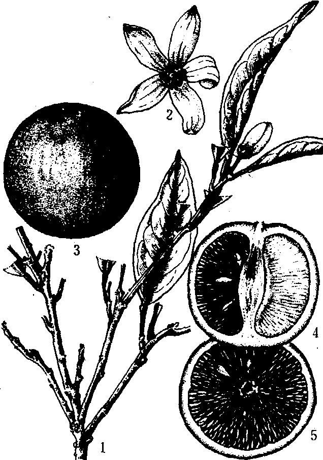释义 | 甜橙sweet orange芸香科柑橘亚科柑橘属常绿果树, 乔木。又名广柑、黄果、橙、广橘。学名Citrus sinensis (L.) Osbeck。 暗 柳 橙 1. 花枝; 2. 花; 3. 果实; 4. 果实纵剖面; 5. 果实横剖面 普通甜橙 ❶新会橙(滑身仔)。原产中国广东新会。新会、广州及广西南部栽培较多, 中国其他柑橘产区有引种。树势中等、较开张。叶长椭圆形, 两端渐尖。果较小, 长圆或近圆形, 果顶常有印圈, 单果重96~130克。果皮橙黄至橙红色, 薄而光滑,油胞细小平生。果肉浅黄色, 汁较少、味香甜、品质优。每果种子10~15粒。含糖11~15%,酸0.25~0.5%, 可溶性固形物13~16%。11月下旬至12月中旬成熟。产量中上, 稍耐藏。本品种对积温要求较高,在广东、广西和福建表现良好,在偏北地区品质下降。 ❷暗柳橙。原产广东新会, 主产广州市郊。广西、福建、四川有引种。树性与新会橙相似。果实圆球形至长圆形(见图),果面柳纹不明显, 果顶常有印圈,单果重120~150克。果肉清甜多汁,品质优。每果有种子10多粒。含糖11~13%,酸0.5~0.9%, 可溶性固形物11.5~13%。丰产稳产, 适应性强, 为广东主要发展名种之一。1982年, 广东省果树研究所等单位从暗柳橙实生后代中选出新品种丰产暗柳橙, 生长快, 早果, 丰产稳产、果大、高糖高酸。在同等条件管理下, 比一般甜橙品种增产15~30%,已在广东推广。 ❸香水橙(叶橙、酸橙)。原产中国珠江三角洲。主产广州、新会, 广东其他地区及一些省均有栽种。树势强健,较开张, 枝梢茂密,有刺。叶椭圆形,基部较宽,翼叶明显, 叶色较浅。果大, 近椭圆形, 单果重124~170克。果皮橙黄至橙红色,油泡突出。果顶无印圈。果肉橙黄色, 柔嫩多汁,甜酸适度而香。每果种子10多粒。含糖9~11%, 酸0.7~1.1%, 可溶性固形物10.5~13%。11月下旬至12月上旬成熟。果实有后熟作用, 可留到春节前后采果, 挂果贮存或经采后贮存品质更佳。本品种有香水橙、红橙和大水橙3个品系。香水橙较高产质优, 红橙较低产, 大水橙经济价值不大。 ❹雪柑。广东汕头原产(也是主产区), 福建、台湾栽培较多, 四川、广西、浙江有栽培。树势强, 枝梢细长, 偶有小刺。叶椭圆形,翼叶不明显。果圆或长圆形,单果重135~187克。油泡较小, 平生或微突。果肉柔软多汁, 甜酸适度, 有清香。每果有种子5~10粒。含糖10~11%,酸0.6~0.9%, 可溶性固形物10~13.5%。11月中下旬至12月成熟。雪柑适应性强, 有大叶、小叶系,大果、小果系, 早、晚熟系。以小果雪柑品质最好, 较丰产。 ❺化州橙。原产广东化州。广东湛江和广西南部栽培较多。树势旺。叶卵状长椭圆形, 叶翼大。果圆形或略扁, 单果重150~200克, 汁多, 较易剥皮。每果有种子约20粒。含糖10.4~12.2%, 酸0.6~1.2%, 可溶性固形物11.5~14.6%。11月中旬至12月成熟。果实除鲜食外,适宜加工果汁, 可制成优质的橙汁罐头。 ❻改良橙。又名漳州橙、红肉橙、红蜜橙、红江橙(广东湛江)。原产福建省龙溪地区。据称为印子柑的嫁接变异。树强健、圆头形、树梢较直立。果球形, 中等大小, 单果重120~150克。皮色橙黄, 果肉柔软, 有黄肉、红肉或黄红瓤瓣相间3种类型。其中以红肉果品质佳, 味甜爽口, 具香味。可溶性固形物15%, 每100毫升果汁含糖11.7克, 酸约0.67克。每果有种子8~12粒。采收期12月下旬至翌年1月上旬。改良橙果形美观, 品质优良, 丰产, 耐贮, 是广东湛江市主要发展品种。 ❼锦橙。原产和主产四川, 其他一些省有引种。树势旺、枝梢开张, 具小刺, 叶姿直立。果长卵圆形,单果重约170克, 皮稍粗, 较易剥, 汁泡柔嫩多汁,甜酸适度, 微香, 质优。每果有种子约10粒。含糖8~10%,酸0.7~0.9%,可溶性固形物12~15%。11月下旬至12月中旬成熟。本品种宜在冬春温暖湿润的四川、湖北等地发展, 在广东、广西和福建栽培,产量低,易裂果,风味变差, 易感溃疡病、流胶病等。较好的同类品种还有先锋橙。 ❽哈姆林甜橙。原产美国佛罗里达州, 欧洲地中海沿岸国家栽培较多。中国引入后分别在四川、广东、福建等地试种。树势旺, 枝叶茂密,小枝粗壮, 叶长椭圆形。果圆球或椭圆形,单果重130~150克。果顶圆, 蒂部微凹。皮深橙色, 肉嫩多汁,甜而香。每果有种子0~3粒。含酸0.8~1.1%,可溶性固形物9%。易感溃疡病。在美国高温地区于10月成熟, 低温地区于11月至翌年2月成熟。在中国产区11月中旬成熟。 ❾伏令夏橙。主产美国、巴西、西班牙等国。中国四川栽培较多,广东、广西有栽培。树形高大, 枝梢较直立, 叶长卵形, 叶翼明显。果圆或长圆形,单果重140~170克。果肉柔软多汁, 品质佳。每果有种子4~6粒。含糖9~11%, 酸1.0~1.3%,可溶性固形物11~12%。在中国产区4月至5月成熟。本品种适应性强,栽培地域广泛, 但在冬季果实膨大期,如遇土壤水分干湿变化大, 易裂果。保证水分均匀供应, 是防止裂果的关键措施。夏橙品系较多, 有刘金光夏橙、粤选1号夏橙、五月红和桂夏橙等。 脐橙 ❶华盛顿脐橙(Washington Navel)。原产巴西, 主产美国、巴西、澳大利亚等国。中国早在20世纪30年代曾引种试栽获得成功, 现四川、浙江栽培较多。枝梢较披垂。萌芽、开花一般较甜橙早。花粉极少,单性结实。果长圆形或广倒卵形,单果重180~250克。果顶有脐,闭合或张开。皮厚薄不匀。果肉脆嫩, 多汁、味浓甜、质优而富香气。无核或1~2粒。含糖8~9%, 酸0.9~1.0%, 可溶性固形物11~12%。11月至12月初成熟。不耐贮, 易感溃疡病。 ❷汤姆生脐橙。由