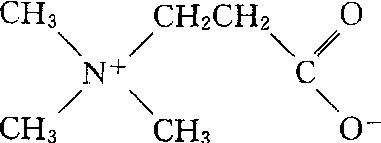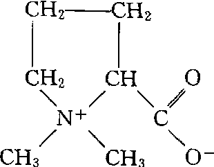 氨基酸氨基上的氢被甲基取代后形成的一类氮甲基化合物或三甲基内盐。常见的有甘氨酰甜菜碱,β-丙氨酰甜菜碱和脯氨酰甜菜碱,其结构式如下。溶解度大,19℃下为157 g/L。主要存在于细胞质中。在干旱或盐逆境中,许多植物体内积累甜菜碱,成为渗透调节的主要有机溶质,对蛋白质和细胞膜有保护作用。其生物合成是由乙醇胺甲基化形成胆碱,再进一步氧化而成。因而与光呼吸和磷脂代谢有密切的关系。