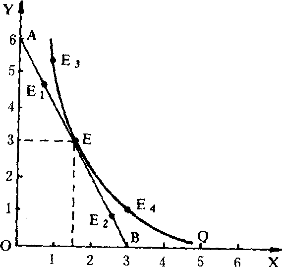 亦称生产资源的最佳配置,西方经济学生产理论的重要组成部分,指生产要素的某种组合使得厂商能够以最低的成本生产出它所希望的理想产量。究竟何种生产要素组合方式才是既能取得最大产量又是现有资金条件所许可的组合方式,西方经济学分析这一问题时使用了等产量曲线和等成本线两种分析工具。等产量曲线是指各种生产要素的不同数量的组合点的运动轨迹,该轨迹表示在一定的技术条件下,某一固定数量的产品可以用所需要的各种生产要素的不同数量的组合生产出来。等成本线是指相等的成本可购买的各种生产要素组合点的轨迹,它表示既定的成本可以购买的各种生产要素数量的最大组合。等成本线与等产量线的相切之点即是最佳的生产要素的组合点。如图: AB线为等成本线,曲线Q为等产量线,X和Y分别代表两种不同的生产要素。切点E所决定的3个单位Y要素和1.5个单位X要素的相结合即是生产要素的最适组合,因为这一点所代表的要素的配合方式,既是现有资金所允许的,又达到了预期的最大产量。除了切点E之外,其它任何一点所代表的组合,要么是符合成本要求而达不到最大产量 (如E1和E2),要么是符合产量要求而不是最低成本 (如E3和E4)。因此,只有等产量线与等成本线的相切之点所确定的生产要素的组合才是生产资源的最佳配置。