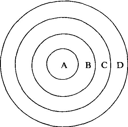 其中A是“身”的层次,个体生命生活的实体;B是“家”的层次,个体最基本的社会关系实体;C是“国”的层次,个体生命意义、社会责任实践的场所;D是“天下”的层次,生命永恒意义的寄托所在。在儒家“修身、齐家、治国、平天下”的理想图式里,其信息传播结构是从个体内向传播推及家族内部传播,再推及社会职责范围的传播,最后推及与天下人人沟通,这样层层递进扩延。反映了生命生活圈与传播活动的同一性,反映了中国传统文化对于个体生存与社会群体生存矛盾关系的渗透性的解决。越接近同心圆的核心,信息量越大,信息对于特定的传播媒介的固定依赖越小,而较多地借助于“言传身带”或“神气声色”。越向外拓展,信息量越抽象和稀薄,传播方式单一化,信息义蕴功利化、社会面具化。这种传播结构的文化功能表现为以下三个方面:(一)造成文化上的强大内聚力。文化内聚力是社会群体生存发展的依托。(二)造成文化的封闭性。处于同心圆传播结构中的人,多数知己不知人,其活动范围和信息渠道使之与外界隔离。认知上习惯于同化对象,而不是顺应对象。(三)内外圈之间是彼此渗透的、可以灵活利用的伸缩关系。个体的人格可以无限放大为社会性的情操,个体生活的每一环节都被赋予兴邦安国、平治天下的宏大意义。研究者针对这一传播结构提出的另一假设性“生命一传播结构”如下图所示: