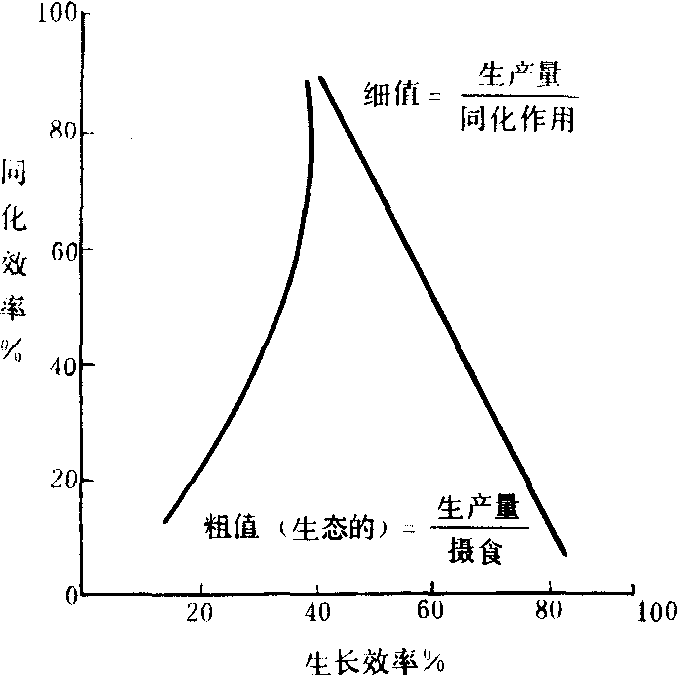 释义 | 生态效率ecological efficiency生产力生态学研究中的重要指标,是在能流过程中食物链不同点上能量的百分比;或是一种或多种生物(或过程)中可利用能量与实际利用能量的百分比;或是所生产的物质量或能量与生产这些物质或能量所消耗的物质量或能量的百分比。可分营养级之间的能量比值和同一营养级中能流过程各个点上能量比值两类。 式中 I为输入能量;t—1和t表示上下两营养级。 ❷林德曼的摄食效率(intake efficiency), 是营养级间摄食量(C)的比值: ❸营养级间同化效率(assimilation efficiency),是营养级之间同化量(A)的比值: ![]() 式中 I为输入能量;t—1和t表示上下两营养级。 ❷林德曼的摄食效率(intake efficiency),是营养级间摄食量(C)的比值: ❹生产效率(production efficiency),是营养级之间生产量(P)的比值: ❺利用效率(utilization efficiency),是营养级输入量(I),或同化量(A)、摄食量(C)与上一营养级生产量(P)的比值: 同一营养级中 生态效率也有多种计算表示法。 ❶组织生长效率(tissue growth efficiency),是生产量(P)与同化量(A)的比值: ❷生态生长效率(ecological growth effici-ency),是同一营养级生产量(P)与输入能量(I)或摄食量(C)的比值: ❸同化效率(assimilation efficiency),是同一营养级同化量(A)与输入能量或摄食量的比值: 对于初级层次A、I即为PG(总生产量)、L(总光量)、La(有用光量)。如对于初级生产者(植物),光合作用效率(photosynthesis efficiency)计算式为: 式中 PN为净生产量; La为可利用的可见光量。在计算各种生态效率时,必须使用相同的单位,最好用能量单位(焦耳/面积/时间)表示。在动物中,组织生长效率与同化效率之间存在相反的关系(见图),而生态生长效率稳定地保持在20%左右。 动物种群中组织生长效率、生态生长效率和同化效率之间的关系 (仿E. B. Welch) 生态效率ecological efficiencies食物链各营养级之间或同一营养级各代谢过程之间,能量在转换前后各种比值的总称。生态效率用来描述能量在传递过程中的有效程度。20世纪40年代初,林德曼(R.L. Lindemen)对湖沼中生物量转移的定量研究指出,能量沿食物链从一个营养级到下一个营养级的转换效率大约为5~20%,平均为10%左右,即著名的十分之一定律。 营养级内各代谢过程示意图 生态效率有多种表示法,属于营养级之间的有:❶摄食效率,为任一营养级的摄食量(It)与其前一营养级的摄食量之比(It/It-1),又称总生态效率或林德曼效率; ❷营养级同化效率为任一营养级的同化量(At)与其前一营养级同化量之比(At/At-1); ❸营养级生产效率,为任一营养级的生产量(Pt)与其前一营养级的生产量之比(Pt/Pt-1); ❹利用效率,为任一营养级摄食量或同化量与其前一营养级生产量之比(It/Pt-1或At/Pt-1),又称食物链效率。前一营养级生产的食物,并不一定全部为后一营养级的生物摄食,有部分食物直接传递给分解者(见表) 。 几个水域生态系统的生态效率(%)