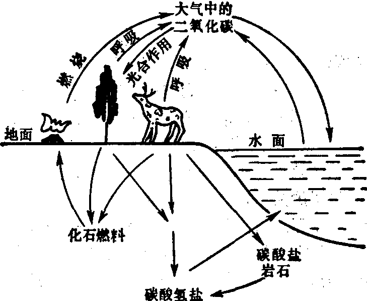 碳循环 碳存在于生物有机体和无机环境中,碳是构成生物体的必需元素。在无机环境中碳以二氧化碳和碳酸盐的形式存在,碳循环在有机体和无机环境中进行。 在空气组成中碳(CO2)占0.0272%,其主要天然发生源是有机物受细菌分解和动植物的呼吸作用;其消耗源则是植物的光合作用,海洋是碳的巨大贮藏库,依其不同条件,既可以成为发生源,也可成为消耗源(图2)。 图2 碳循环 大气中二氧化碳通过绿色植物的光合作用转变为葡萄糖,然后再进一步转变成为碳水化合物、脂肪和蛋白质,从而被固定在有机体内。动物(包括人类)摄食植物,在将碳水化合物氧化过程中,排出二氧化碳,释放到大气。当人和动植物死后,其尸体受微生物作用,将蛋白质、脂肪、碳水化合物分解氧化成二氧化碳、水和无机盐,其中二氧化碳返回大气。动植物尸体长期深埋地层中,可能形成各种化石燃料,燃烧这些化石燃料时,所形成的二氧化碳也回到大气中。 大气与海洋间的二氧化碳交换,主要决定于大气和海洋间的二氧化碳分压何者为大,如果大气二氧化碳的分压高,则大气中二氧化碳就溶入海洋。海洋中的碳有一部分以碳酸钙沉积在海底,形成新的岩石,使一部分碳较长时间贮藏在地层中,当火山爆发时,又可以使地层中的一部分碳回到大气。 氧循环 氧是构成生命的重要元素,在空气组成中约占21%。大气中的氧来源于绿色植物的光合作用,即在太阳光能下使水和二氧化碳合成碳水化合物,并放出氧(CO2+H2O+光能→CH2O+O2↑)。氧是维持生命所必需的元素,各级生物对能量的需要主要通过氧代谢才能获得。通过呼吸作用吸入氧,在体内酶催化下,将摄入的碳水化合物、脂肪和蛋白质等营养物质进行氧化分解,释放出能量,最后将复杂的有机物质变成水和二氧化碳,通过肺呼出(图3)。 图3 氧循环 动植物尸体被细菌分解后,这些基本元素散布于土壤、空气和水中,于是植物又可以吸取它们,借光合作用再变成能量,循环不息。所以光合作用不仅制造生命所需的能量,同时也产生了极重要的氧气。 氧的循环总是和碳的循环连在一起的,由于光合作用和呼吸作用的关系,这两个元素在地球上进行着紧密相连的自然循环。碳以气态二氧化碳或溶解的方式通过光合作用进入有机界,又通过生物呼吸作用回到大气和海洋中;同时,氧被动植物的呼吸作用所消耗,通过植物的光合作用再释放到大气和水中。 氮循环 氮存在于生物有机体和大气中,是合成生物体内蛋白质的必需元素,在空气组成中氮占79%。氮循环是在有机圈和无机圈中周而复始的进行(图4)。