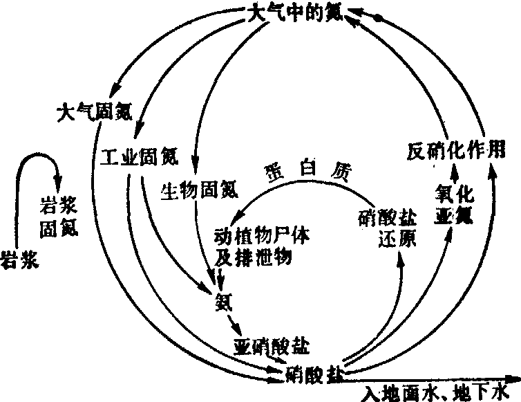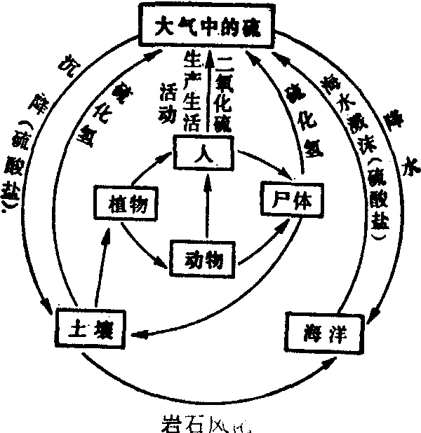 大气中的氮是一种惰性气体,绝大多数生物都无法直接利用,只有被“固定”成为一种含氮化合物后,才能作为生物的必需物质。大气中的氮进入生物有机体有三个途径: ❶生物固氮。主要由豆科植物根瘤菌固定大气中的氮,供植物吸收。 ❷工业固氮。人为的将大气中的氮合成氨或铵盐,供植物利用。 ❸大气固氮。火山爆发、闪电等自然电离现象,使大气中的氮氧化成硝酸盐,经雨水冲淋进入土壤。土壤中的氨或铵盐,经硝化菌的作用,形成亚硝酸盐或硝酸盐,被植物利用;在植物体内,与含碳分子结合,形成各种氨基酸和蛋白质。动物以植物为食,从植物中摄取蛋白质,作为本身蛋白质的组成来源。动物的废弃物和动植物尸体在土壤微生物的作用下,被分解成氮、二氧化碳和水。土壤中的氮经硝化作用形成硝酸盐,一部分为植物利用外,另一部分在反硝化细菌作用下,又分解成为游离氮进入大气,完成了氮的循环。 硫循环 硫是构成生物有机体的主要元素,很多蛋白质都含有硫的原子,能够把一个蛋白质分子的一部分和另一部分连接起来,起着支撑作用。如无此硫链,蛋白质不能维持它的立体结构。硫在自然界中以硫化氢和二氧化硫的形式存在。 大气中硫有三分之一来自人们生产和生活活动,大部分来自海洋溅出的浪花和生物腐败产物——硫化氢。硫化氢、二氧化硫和硫酸盐均能被雨水或雾吸附而沉降入海洋和土壤中; 降入土壤的硫酸盐被植物吸收而生成有机物,植物作为饲料又转入动物体内,经生物化学作用合成蛋白质。当动植物的尸体残骸埋入土壤时,又被微生物分解成硫酸盐及硫化氢; 硫化氢进入大气中经氧化又生成硫酸盐,再沉降于地面,重新开始又一次循环(图5)。 图5 硫循环 大自然中的物质循环,并不只限于水、碳、氢、氧、氮和硫的循环,其他化学元素如Mn、Zn、Cu、K、Ca、Mg等,也都有它自己的循环; 而且每一循环很少是单一元素的循环,往往是众多的元素处于同一循环中。各种元素所组成的千变万化的物质,就是多种元素在各种循环运动过程中不同阶段的产物。 生态系统中的能量流动,绝大部分是单一方向进行的。这是太阳光光量子的功能被转变为有机化合物的潜能,继而通过食物链(网)进行传递的过程。 自然界的物质循环和生态平衡,并不是一成不变的,而是在各种矛盾的运动中发展的。自然的因素或人为的因素都可能影响某一生态系统的某一环节,从而破坏平衡。自然因素如气候异常、火山爆发、地震、水旱灾害、风等,由于这类原因引起的生态平衡破坏,称为第一环境问题。人为的因素主要指人类的活动所引起的生态平衡的破坏,如对自然资源不合理利用,盲目地砍伐森林,随意排放工业“三废”等带来的环境污染,由这些原因引起的生态平衡破坏,称为第二环境问题。 自然因素和人为活动虽然会经常给生态系统带来各种污染和问题,但是在某种情况下,生态系统又能建立一种新的平衡。这种平衡的建立有赖于生态系统的自净能力。例如,利用绿化植物来净化大气,就是一个很好的例证。一平方米的草坪每小时可吸收二氧化碳1.5g,一公顷针叶林每天可以消耗二氧化碳1t,一公斤西红柿的叶子每天可以消耗大气中氟3mg,一公顷云杉林每年可滞尘32t,一公顷松林每年可滞尘36t,所以为了消除或减少环境污染的危害,人们也可以采用植物净化的方法。这样生态系统可以由平衡——不平衡——达到新的平衡。 ☚ 人类与环境 环境污染 ☛ |