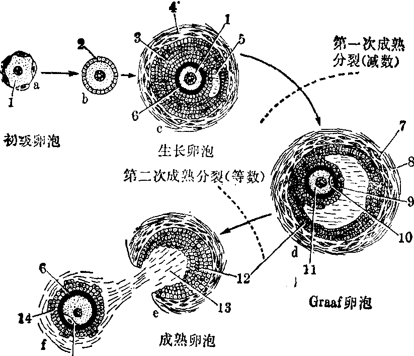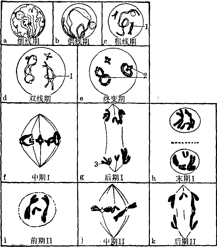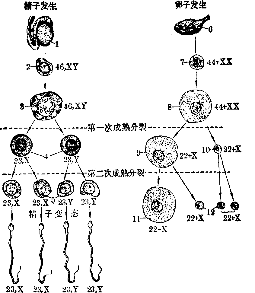 释义 | 生殖细胞generative cell又称性细胞。生物繁殖下一代的细胞。 生殖细胞机体繁殖下一代的细胞。包括精子和卵子。 生殖细胞又称“性细胞”。生物繁殖下一代的细胞。一般指卵和精子,以及所有产生卵和精子的细胞。卵和精子的染色体是单倍数的。 生殖细胞 生殖细胞生殖细胞是具有生殖能力,连续亲、子代以绵延后代的配子或孢子,是质量上有别于体细胞而仅含单套遗传物质的单倍体细胞。在无性生殖中,个体藉产生无性的孢子繁殖后代;在有性生殖中,个体产生雌、雄两性生殖细胞,通过二者的结合开始子代的发育。雌、雄生殖细胞(精子和卵子)分别发生于睾丸和卵巢中。睾丸中精子发生的过程称为精子发生; 卵巢中卵子的发生过程称为卵子发生,二者总称为配子发生。其成熟分化过程有赖于性激素的作用和附属生殖腺提供的生理条件。人类原始生殖细胞来源于卵黄囊壁内胚层,沿系膜和血流移入生殖嵴,参与生殖腺的形成。随着睾丸与卵巢的发生,原始生殖细胞大量繁殖,演变为精原细胞或卵原细胞。胚胎期及生后一定时期均停留于这一阶段,一直到青春期,才在激素作用下通过一系列包括减数分裂的生长成熟程序,演变为有生殖力的生殖细胞。胚胎发育开始于成熟精子与卵子结合的受精过程。受精时,精子与卵子的单倍体遗传物质合并,使受精卵恢复为双倍体的染色体数量,藉以维持物种遗传与发育的恒定。 图1 配子发生图解 1.睾丸 2.精原细胞 3.初级精母细胞 4.次级精母细胞 5.精子细胞 6.卵巢 7.卵原细胞 8.初级卵母细胞 9.次级卵母细胞 10.第一极体 11.成熟卵子 12.第一极体与第二极体 生殖细胞减数分裂时染色体及DNA的变化 任何物种的染色体数量都是恒定的,不同物种有不同的二倍体染色体数。二倍体数的维持有赖于染色体本身的自我复制。体细胞进行普通有丝分裂之前,每一染色体的DNA复制一次,使其数量增加一倍,然后再平分至二个子细胞中,故分裂后仍为二倍体,以保持恒定。生殖细胞单倍体数的维持则靠成熟分裂时的减数分裂,使染色体数减半。减数分裂的特点之一是染色体中的DNA只复制一次(只有一个细胞周期),而随之而来的细胞分裂却连续两次;特点之二是同源染色体的联会,在联会过程中,父源与母源染色体联会成对,并在其染色单体之间形成交叉结,进行片段或局部物质交换。后期时,联会的父源染色体与母源染色体互相分离,随机分配至子细胞,结果导致基因重组和产生遗传变异。减数(成熟)分裂基本上也是有丝分裂,第一次成熟分裂也分为前期、中期、后期和末期四个阶段(图2),但其前期较为复杂,又分为五个亚期: ❶细线期:每个染色体均表现为细长线状(图2,a),染色粒呈串珠状沿长线排列,又称染色线,为二倍体数量(2n=46); ❷偶线期:来自父源及母源的长短相等、染色粒相对应的同源染色体彼此靠拢配对(图2,b),称为联会。在联会的染色线之间形成联会复合体,组成23对染色体。染色体数量为二倍体(2n=46); ❸粗线期:每一染色体由于DNA复制一倍,所形成的染色体收缩变粗,外观为纵行排列的粗短双线结构,又称双价染色体。二同源染色体组成的联会对共有四个染色单体,称为四联体(图2,c)。此时的染色体数量为二倍体(2n=46),而DNA含量则为四倍体。在相邻同源染色体的染色单体之间还形成交叉结,其间发生局部的片段互换; ❹双线期: 同源染色体开始分开,交叉结处的连结关系和每一同源染色体的二个染色单体所呈现的双线状均较明显。交叉和片段交换只在父源和母源的染色单体中进行(图2,d); ❺终变期:分离中的同源染色体高度浓缩,达到最短粗和交叉结最为清晰阶段。此时核膜开始消失(图2,e)。 图2 减数分裂图解 1四联体 2交叉结 3二联体 进入中期时,出现由中心粒形成的纺缍体,双价染色体汇合在纺锤体的赤道板上,排列成行。纺锤丝与各同源染色体的着丝粒相连,父源和母源染色体的着丝粒各趋向一极,但每一染色体的着色粒本身并不分裂(图2,f)。 后期时,同源染色体各自开始向相对的两极移动,分成二组(图2,g),每组23条,每条含成双的姊妹染色单体,称为二联体。末期时,二组染色体分别分到二个子细胞中。这时核膜、核仁重新出现(图2,h)。继之出现胞质分裂(也可滞留至第二次成熟分裂时进行),形成二个各得到单倍体染色体数量(n=23),而含二联体(DNA为二倍体)的次级精母或次级卵母细胞。初级精母细胞分裂成的二个次级精母细胞在性染色体上有差异,其中一个得到22+X,另一个得到22+Y,以后形成二种类型的精子,在受精时对性别决定起决定性作用;次级卵母细胞则均为22+X,故卵子只有一种类型。 减数分裂中的第二次成熟分裂通常紧接第一次分裂之后(图2,i,j,k)。次级精母或次级卵母细胞往往立即过渡至第二次分裂的中期。其特点是并无DNA复制过程,每一染色体的着丝粒分裂为二,循普通有丝分裂方式,将姊妹染色单体平分至二个子细胞中,使精子细胞(或卵子细胞)各得到仅含单体(DNA为单倍体)的染色体23条,生成了在染色体数量和DMA含量上均为单倍体的精子或卵子。 生殖细胞发生过程中的上述变化具有多重意义: ❶通过减数分裂产生单倍体的配子,使生殖细胞的染色体数量减为体细胞的半数。这是维持物种遗传的必要条件,只有这样才能在每次受精时使染色体的数量藉精、卵的结合而由单倍体回复至二倍体; ❷性染色体X、Y在减数分裂时