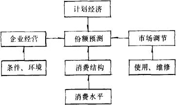 工业(农业)企业的产品在该种产品生产中所占份额、商业企业的产品流通在该种产品流通中所占份额以及与其他各种因素的相互关系的预测方法。其原理关系为: