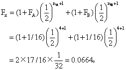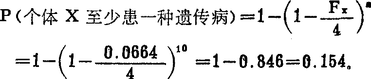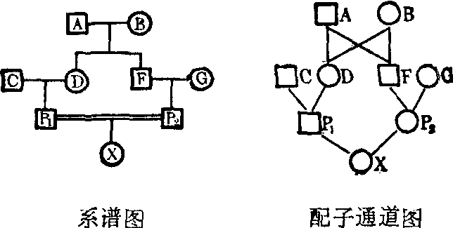表3中C代表4个男孩都正常的事件。如果S的基因型是Nn,那么S有4个正常儿子的概率是(1/2)4,所以P(C/Di)=1/16;如果S的基因型是NN,那么4个儿子当然都是正常的,所以P(C/Di)=1。 其次,我们知道R是杂合体,所以S是杂合体Nn和纯合体NN的机会各为1/2。从而 ![]() 最后把这些数字代入Bayes公式,算出这系谱的概率如下: 因为S生了4个正常儿子,所以可能性是16:1,那就是说,S很可能是NN而不是Nn。她是携带者的机会已由1/2降到1/17,因为她的4个正常儿子提供了另外的信息。从而T是携带者的概率是1/34。如果T有一个儿子,他是自毁容貌综合征的机会是1/68,或者说低于1.5%。 近婚系数 是表达近婚程度的度量。在近亲婚配中,原来因杂合而没有表现的隐性病基因从共祖先通过父母的渠道而在子代中纯合的可能性比一般婚姻的为大,使得病基因纯合体的表现概率在近亲婚配所产的子代中也大为增大。因此,对于近亲婚配近到什么程度的度量引起了婚姻咨询工作的重视,其度量值以近婚系数(F)表达之。F值可以从个体的系谱调查结果推算之,只需循谱追踪到他父母的共祖先,然后估计在每个分离上的概率,通过概率相乘和概率相加的定理,就可以计算出该个体的近婚系数F的值。如:一个个体的双亲P1和P2是嫡表兄妹,而下面系谱所示者,P1的母D和P2的父F是同胞兄妹(图2)。 图2 一个近亲结婚的家系及其配子的通道图中□=○表示近亲结婚 先作系谱图,然后绘制共祖先的配子通道图。图中每一个体用字母标明,配子通道图中每根直线代表配子的通道。追踪双亲P1和P2联到共同祖先A和B的通道。共有两条通道把P1和P2联起来,一条是P1DAFP2,另一条是P1DBFP2。当A的某对等位基因a1和a2分配在他的配子中时,在一配子得到a1的概率也是1/2,因此D和F从A获得同样基因的复制品的概率是1/2,这是因为D得a1,同时F也得a1的概率是1/2×1/2=1/4,D得a同时F也得a ![]() a2的复制品的概率为 ![]() ![]() ![]() 同理,X从另一共祖先B得到两个同样等位 基因的概率在本例中也是1/32。因此,X不论从A或从B得同样等位基因的概率是两个1/32之和,即 ![]() ![]() ![]() ![]() ![]() 假定在以上所举的例子中,两个共祖先A和B都是亲表兄妹所生,他们分别有FA=FB=1/16,那么,用上式就可以计算出: 这比原先当FA=FB=0时,Fx=0.0625略大些。这个概率值说明个体X的任一位点上的基因对“后裔同样”的可能性,它可以用来估计他所拥有的全部基因中属“后裔同样”的基因对所占的百分率。因此,共祖先A和B所携带的隐性病基因愈多,在X身上表现出某种遗传病的可能性愈大,例如A和B不带任何病基因,那么X即使有6.64%的“后裔同样”的纯合体基因对,他也不会患任何遗传疾病。但据一般估计,我们每个人都或多或少地携带2~3个乃至7~8个处于杂合状态中的隐性病基因,所以要是A和B总共有10个致病基因与正常基因以杂合状态散布在10个不同位点上,那么X表现一种以上的遗传病的可能性为: χ2检验法 为了描述在遗传理论预期数与调查或实验计数之间的吻合程度,需采用一种数理统计方法。这种方法称为χ2检验法。χ2是统计量,它的定义公式是: 表4 χ 2 简 表