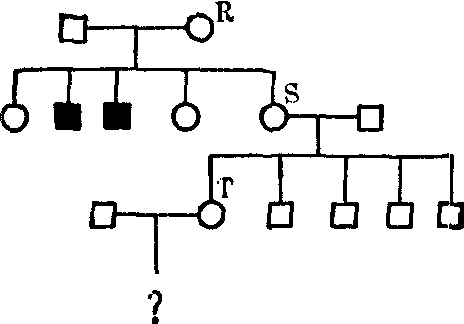 r2=0.46684,∴r=0.683 其次,可以看到B型和O型频率相加乃是:q2+2qr+r2=![]() 基因IA: p=0.257或25.7% 基因IB: q=0.060或6.0% 基因i: r=0.683或68.3% 总计:p+q+r=1或100% 系谱概率 概率是可能性或机遇的定量度量,譬如说有人怀了孕,生下来是男是女尚未可知,但是凭理论和经验,是男是女的可能性或机遇大约各有一半,也就是说生男的概率P(生男)=0.5,生女的概率P(生女)=0.5。类此生男、生女称为互不相容的事件,互不相容的可能事件有时不止两种,例如上节中的A、B、O、AB四种血型就都是互不相容的。概率还可从群体通过随机抽样所得的调查结果频率估计之。在上述ABO血型调查中,如在同一群体随机找一个尚未验过血型的人出来,那么,在未验之前就可以说他的血型为A的可能性为0.417,写成:P(A)=0.417,同样可以写出他的P(B)=0.086,P(O)=0.467,P(AB)=0.030(都只取3位有效数字)。如果事件C与早先出现过的事件D有关联的关系,则在发生了事件D的条件下发生事件C的概率称为条件概率,记为P(C/D)。反之,如C在D先,则在发生了事件C的条件下发生事件D的条件概率记为P(D/C)。条件概率的定律为: 从条件概率的定律可以延伸出一个Bayes逆概率定理: 设事件D1,D2,D3,… Dn是互不相容的事件,设事件C跟这K个D事件中的第一个Di事件有关联,则各Di(i=1,2,……k)的条件概率为: 举计算系谱概率的例子:自毁容貌综合征是X连锁遗传的,患者有严重的精神障碍和运动紊乱,往往在幼儿期死亡。有一妇女(T)的两个舅舅有这种病(图1),如果她生一儿子,则儿子是否有病?从图1可以看到,R生了两个有病的儿子,所以R是杂合体,带有一个致病基因。同时又知道,R的女儿(S)有1/2的机会由遗传得到这个基因; 而R的外孙女(T)有1/4的机会由遗传得到这个基因。但T有4个正常的弟弟,能够对T的基因型提供另外的信息吗?因为S有4个正常儿子,所以她更可能是纯合体,而不是杂合体。我们用N代表正常基因,n代表致病基因,现在可以用Bayes公式来进行计算。 图1 自毁容貌综合征系谱(X连锁遗传) 表3 根据不同假设,计算条件概率