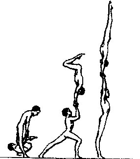 释义 | 甩倒立 甩倒立指“上面人”团身悬垂在“下面人”手上向上摆起成手上倒立动作。摆动动作的一种。“上”在前同向站立,双手普通握。经稍屈膝,“上”向前上跳起同时“下”将“上”向前上托举送出,“上”低头含胸,屈膝提臀,团身前翻。经“下”分开的双腿顺势后摆。回摆过腿垂面后,“下”即迅速用力蹬直双腿,上体后仰,向上领臂,将“上”提至胸水平,一腿前跨两手翻腕上举,“上”顺势顶肩伸直身体上至倒立部位。在摆动过程中“下”应及时调整上体的位置以保持平衡。关键在于两人用力协调,有节奏的配合,充分利用摆动及掌握翻腕、顶肩伸直身体的时机。可选用团身悬垂摆动;在帮助下“上”团身仰卧甩至屈臂手上倒立过渡至完整的甩倒立练习。帮助者站于体前侧,上摆时,一手托腰一手托肩上举,帮助上成手倒立或站于体侧高位,上摆时双手托髋部上提,帮助上成手倒立。 ☚ 手上单臂直角慢起手倒立 “上”地上头倒立“下”拉起成手上倒立 ☛ |