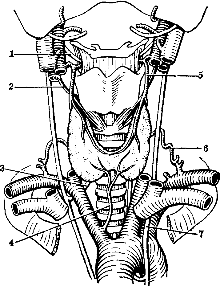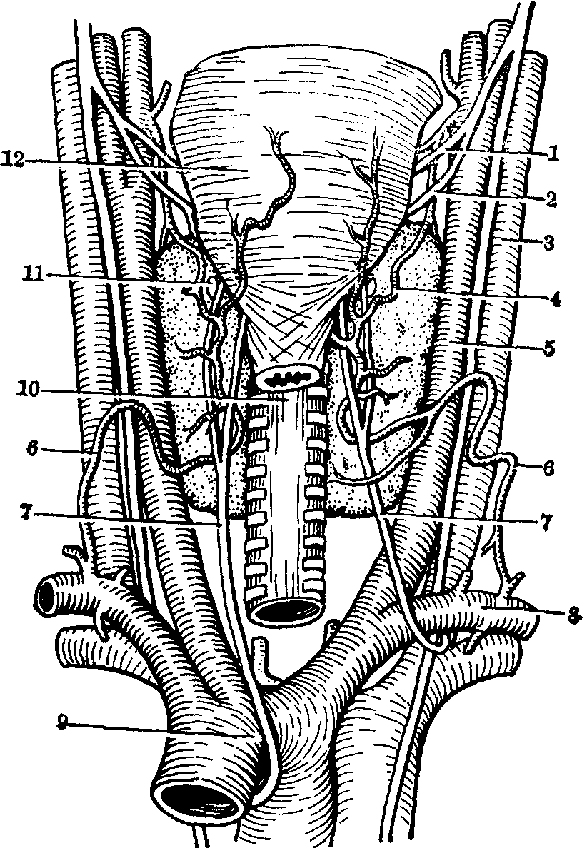 释义 | 甲状腺区 甲状腺区甲状腺区位于颈前正中线两侧的肌三角范围内,其中心结构是甲状腺。甲状腺具有真、假被囊。真被囊是腺体的组成部分,紧包腺体并伸入腺内,不易剥离; 假被囊包于真被囊外,由舌骨下肌群的筋膜构成 (腺后可能无真被囊)。在真、假被囊之间有上对甲状旁腺;下对甲状旁腺则位于假被囊以内或以外,但喉返神经居于假被囊外。故囊内甲状腺切除术,可避免喉返神经的损伤。甲状腺固着于气管软骨环的大量纤维组织称为粘连带或悬韧带,吞咽时,可使腺随喉上、下移动。此点有助于甲状腺包块的鉴别诊断。粘连带在腺中1/3的后面粘连最紧。副甲状腺可沿已消失的甲状舌管所在位置的任何部位出现。但亦可在其他部位单独出现。 图1 甲状腺及其神经血管(前面观) 甲状腺的毗邻:前面为皮肤、浅筋膜(内含颈阔肌及其深面的皮神经和颈前静脉等)、深筋膜、胸骨舌骨肌和胸骨甲状肌及包覆肌的筋膜。腺左右叶的内侧邻喉与气管、咽和食管及喉返神经等。腺后方紧邻甲状旁腺;左右叶的外侧为颈动脉鞘; 鞘浅面或深面有颈襻; 鞘后面与交感干之间有椎前筋膜。甲状腺肿大时,可压迫邻近器官,出现相应的症状。腺左右叶的上、下极有神经血管构成的甲状腺上蒂和下蒂。 图2 喉返神经与甲状腺下动脉的关系 甲状腺有成对的甲状腺上、下动脉和甲状腺上、中、下静脉。甲状腺上动脉有时为双支; 甲状腺下动脉亦可出现双支,或一侧缺如者。偶而还存在甲状腺最下动脉(3%)。此外,分布于气管、食管和喉的小动脉也发小支供给甲状腺。所以,腺的血液供给极为丰富;甲状腺肿大时容易听到血管杂音;甲状腺大部切除时,结扎成对的甲状腺动脉、静脉之后,残留的腺体仍能存活。因此甲状腺手术中,止血是一关键步骤。甲状腺上动脉伴喉上神经喉 图3 甲状腺的毗邻及其神经血管(后面观) 甲状腺下动脉与喉返神经及下对甲状旁腺的关系甚为密切。左、右喉返神经发自迷走神经的部位不同。左侧者钩绕主动脉弓,位置较深,且靠近正中平面,行程亦较长。所以在气管食管沟内直行向上,行于甲状腺后方。右侧者钩绕右锁骨下动脉,位置较浅,且远离正中平面,行程较短;多斜行于气管食管沟的前方(即气管的外侧)。倘右锁骨下动脉不发自头臂干,而直接发自主动脉弓的末端,当其行经食管后方达右侧时,则右喉返神经不钩绕右锁骨下动脉,而由颈中部直接横行潜入腺后方。甲状腺下动脉与喉返神经的关系见图2。由于右喉返神经的行程及其与甲状腺下动脉分支的关系特殊,故在手术中误伤右喉返神经的机会较多。下对甲状旁腺多位于甲状腺下动脉潜入腺体后方的附近,因此结扎甲状腺下动脉时,多以远离叶外侧缘为宜。左、右喉返神经多分为2支,主要行经甲状腺侧韧带深面,亦有穿经韧带者,但无一例外地都行经环甲关节的后方入喉,故环甲关节常是寻找喉返神经的重要标志。 ☚ 腮腺咬肌区 结肠上区 ☛ |