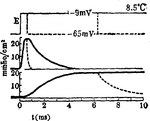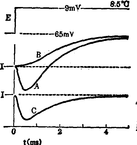释义 | 电压固定实验 电压固定实验根据Hodgkin等提出的理论,动作电位的产生和复极,关键在于膜对不同离子通透性的改变。Hodgkin等(1949)用著名的电压固定实验,对膜的离子通透性进行直接测量,确定出它们变化的幅度和时间经过。通过这类实验,他们对Na+、K+等离子的通透性随膜电位水平和时间因素变化的情况,即所谓离子通透性的电压依从性和时间依从性的问题,作了定量的、动态的描述,为近代兴奋膜生理学奠定了坚实的基础。这个方法至今仍然是研究兴奋膜特性和与之有关的离子动力学基础的基本方法之一。 图1 在枪乌鲗巨大神经轴突进行电压固定实验的模式图 不难看出,电压固定实验的意图就是在膜电位突然跃变并固定于某一数值时,观察膜电流的改变,由此再算出膜电导即膜通透性的改变。因为膜有电容的性质,当外加电源以一个不同于原静息电位数值的电压作用于膜时,由于膜被充电或放电,膜上将出现一个短暂的电容电流,但这个电流一般只维持数个微秒,因而我们在整个电压固定期间所看到的膜电流的改变,主要是由离子通过膜所造成的离子电流的改变。Hodgkin等在实验中观察到,如果把巨大轴突的膜电位由静息时的-65mV突然固定到-130mV的水平,这时并不引起离子电流的改变;但如果将膜电位向去极化的方向改变,例如将膜电位固定到零电位附近的水平,则将引起膜电流的明显改变。图2A是将膜电位固定于-9mV时出现的离子电流的变化情况,即首先出现一个持续1~2ms的内向电流,它以后又被一个明显的外向电流所代替。这个结果正是“钠假说”所预期的。他们又用以下一些实验证明了内向电流是由Na+内流所造成: ❶用氯化胆碱代替海水中的NaCl时,内向电流不再出现,整个离子电流曲线由A变为B,将两条曲线作代数相减,可得曲线C,它应代表钠电流INa的变化情况,曲线B则应是造成膜复极的外向的钾电流IK; ❷如将膜电位固定于与Na+平衡电位相同的水平,内向电流也不出现,因为理论上这时即便有钠通透性的增大,膜内的正电位也正好能阻止Na+的净内流,故INa应为零,而这就从反面证明了内向电流是Na+的内流造成的。此外,利用示踪性同位素和轴浆灌流等实验,也证明了上述外向电流主要是由K+的外流造成的 。六十年代后期发现某些药物可以选择性地阻断膜对某些离子的通透性,如河豚毒、贝介毒(Saxitoxin)可阻断Na+的通透性,四乙铵和其他季铵类离子可阻断K+的通透性,这些发现一方面为分离不同的离子电流提供了方便的手段,一方面也提示这些离子的通透性可能是由相互独立的专用膜通道来决定的。 图2 电压固定实验时的膜离子电流的变化 将枪乌鲗巨大轴突的静息电位突然由-65mV固定到-9mV的水平时(上方E曲线表示),膜的离子电流的变化情况(中间曲线A)。B、C曲线的意义见正文。曲线在点线下方为膜内向电流,在点线上方为外向电流 根据电压固定实验中得到的INa和IK的变化情况,就可以由下式分别算出钠电导(gNa)和钾电导(gK)的变化情况: gNa=INa/(E-ENa) (1)gK=IK/(E-EK) (2) 式中E是实验中保持固定的电压值,EN ![]() 图3 由图2中钠电流和钾电流变化曲线算出的钠电导(中)和钾电导(下)变化曲线 上方曲线表示电压固定的数值,中、下方实线分别为去极引起的钠电导和钾电导变化情况。虚线表示膜的固定电压的去除时间及由此引起的膜电导的恢复情况 ☚ 生物电产生原理 兴奋膜特性的数学模拟 ☛ 电压固定实验 电压固定实验voltage clamp experiment又称“电压钳制术”。系Hodgkin等(1949) 创立的著名的研究兴奋膜特性和与之有关的离子动力学基础的基本方法。Hodgkin等设计了一个用负反馈原理构成的电子学线路,在巨大神经轴突进行电压固定实验。其中金属丝电极E'插入轴突内一段距离,用来测量这一段膜电位数值,此电极连于一个高阻抗跟随器(X1),后者的输出记录于E,同时输给反馈放大器(FBA),将所测得的膜电位与实验中要求固定的膜电位不断进行比较,如果前者偏离了后者,则根据二者的误差信号,立即由放大器输出一定量的电流,经插入轴突的另一电极I'通向膜内,此电流的大小和方向刚好能抵消引起膜电位波动的膜电流,保持膜电位固定于规定的数值不变。整个过程都由电子学回路自动完成,不论膜电流怎样变化,E上总保持固定的电压值,这时所看到的变化,只是通过电极I'和膜外另一接地电极之间的电流变化,记录于I上。它虽然表示了用来抵消膜的离子电流的外加电流的变化情况,却正是我们要测定的膜电流变化的镜象。电压固定实验的数据就是由此而取得的。 ☚ 相关电压现象 电压钳制术 ☛ |