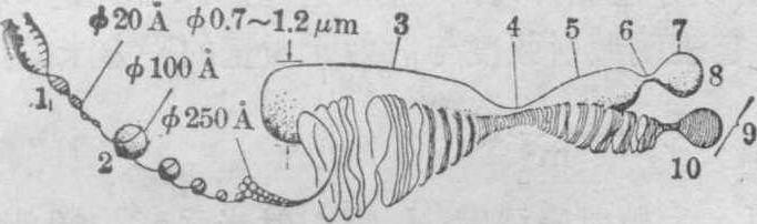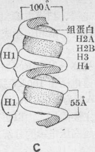 释义 | 电子显微镜在生物学和医学中的应用 电子显微镜在生物学和医学中的应用随着电镜在生物学研究中的广泛应用,促使细胞生物学、分子遗传学和分子生物学等学科得到了迅速的发展。 图1 细胞超微结构照片(×7200) 的结构(图1),用负染色法发现内膜上具有一种有序的重复结构,每个重复单位含有三个亚基,即球状头 (直径约90Å)、短柄(33×50Å)和基部(60~115A)这就是位于线粒体内膜的ATP酶复合体。这种结构称为基粒,它为阐明线粒体内膜上的电子传递、氧化磷酸化提供了形态依据(见“膜的能量传输”条)。高分辨率电镜还观察到核糖体的大、小亚单位,并能直接观察到信使核糖核酸将核糖体串联成多核糖体。分子遗传学 高分辨率电镜对染色体、染色质结构以及DNA的复制、转录等方面的研究均提供了形态依据。例如Miller等人用电镜直接观察了两栖类卵细胞的转录过程(图2)。对两栖类卵细胞的灯刷染色体,对果蝇的巨大多线染色体作了大量电镜观察,结合电镜放射自显影和电镜细胞化学等技术进一步明确了这种染色体上的膨体为伸展的DNA单链,具有活跃的复制、转录活性,而染色体上的染色粒为高度螺旋化并卷曲的DNA单链部分,无活性。证实了只有在DNA双链展开成单链解旋的情况下才能进行复制与转录。由于近年来多种技术的合并使用,证明染色质及染色体由一条DNA分子构成, 图2 RNA转录的电镜图象 即染色体“单线”。并证明分裂间期的异染色质为螺旋卷曲的非活动区域,而常染色质为伸展的具有复制、转录活性的区域。Woodcock (1973)、Olins(1974) 等人用高分辨率电镜发现染色质细丝上有串珠样的重复结构,即每隔30~70个DNA碱基对的间隔距离就有±100A直径的球状结构出现,称为核小体,这种结构相继在各种动物的染色质上证实,并证明这种重复单位是由约含200个碱基对的DNA分子与八个组蛋白分子构成。八个组蛋白分子中有H2A,H2B,H3,H4各两个 (图3之A)。最近用中子衍射技术对核小体进行了深入研究,证明由组蛋白分子H2A,H2B,H3,H4各一个构成一盘状结构,再由两个这种盘状结构两两相对形成一个球状的组蛋白分子八聚体。DNA分子缠绕在盘状结构外。每个组蛋白分子伸出一尾状分支将DNA分子固定住。随着功能状态的不同,尾支的长度与位置可有变化(图3之B)。 综合电镜所见及中子衍射检测结果可得核小体的模式图(图3之C)。 ![]() 图3核小体结构示意图A电镜观察结果 B中子衍射结果 C综合分析结果 根据高分辨率电镜多方面观察结果,可将染色体的分子结构综合成以下模式图(图4)。分裂间期染色质的分子结构图见图5。 常染色质为伸展的或比较伸展的DNA分子,具有复制与转录的活性,而异染色质为屈曲缠绕的DNA分子,无复制、转录活性。 图4 染色体的分子结构示意图 图5 分裂间期染色质分子结构模式图 分子生物学 高分辨电镜结合其他技术为观察核酸大分子结构作出了贡献。例如对细菌和病毒的DNA、RNA分子的观察(图6 ),研究了结构与功能的关系,它们的复制转录过程,以及一些病毒DNA分子链上基因密码顺序的确定等。这对于了解致癌病毒的核酸片段如何掺入宿主基因诱发癌变,阐明癌变原理有重要的理论与实际意义。 图6 SV40 DNA分子超微结构图 近年来电镜结合X线衍射研究血红蛋白的分子结构取得重要进展。已拍出一些化合物的原子排列图像,如2Nb2O5 ·7WO3结晶的电镜照片中Nb,W及O原子的排列清晰可见(图7)。电镜观察分子中的原子排列结构是近年来电镜术的一大进展。它们都是直接观察图象,不像X射线及中子衍射等技术将收集到的数据经电子计算机处理方能解出其结构图。因此电镜观察比较简单、直观、快速。此外所观察的分子标本不必培养成结晶,更接 图7 2Nb2O5·7WO3结晶的电镜照片(× 2250000) 近于自然状态。☚ 电子显微镜 X射线衍射 ☛ |