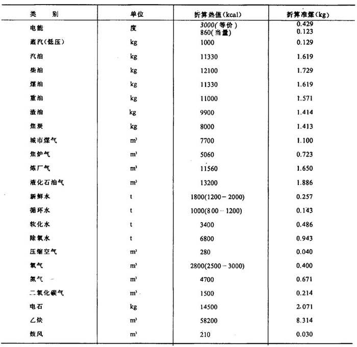 释义 | 企业能源利用率的定义式 [说明]对全厂来说,需要考虑供给它的能源,包括燃料(煤、油、天然气)、焦炭、外购水、电、汽等,即全厂供给能源的有效利用程度。因此,采用企业能源利用率来反映整个企业的用能水平。 [注意]企业消耗的各种外购能源按二次能源平均折算热值表(表5-1-7)进行折算;本厂自产蒸汽发电按实际消耗折算。 表5-1-7 二次能源平均折算热值表 注:[kca]=4.1868kJ |
