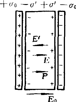 释义 | 电极化强度矢量 电极化强度矢量dianjihua qiangdu shiliang描写电介质极化程度的物理量,它等于单位体积内分子电(偶极)矩的矢量和。在电介质中取一物理无限小体元△τ,体元内所有分子电矩矢量和Σpi与△τ之比,定义为该宏观点的电极化强度矢量 它的单位是库仑/米2。极化前,若是无极分子,pi=0,必有Σpi=0故P=0。对有极分子,由于热运动,仍有Σpi=0,P=0,即无外场时,极化程度(电极化强度矢量P)等于零。在外电场作用下,电介质极化,每一无极分子沿E方向位移极化而形成一电偶极子,其电矩pi∝E,因而△τ内的Σpi≠0,P≠0,P随E增强而增强。对有极分子,在电场中沿电场E做取向极化,E愈强取向也强,使△τ内的Σpi≠0,P≠0,且P随E的增强而增强。可见,不论什么类型的电介质,由于极化,将出现极化强度矢量P,极化愈强,矢量P也就愈大,因此矢量P描述了电介质的极化程度。当电介质处于确定的极化状态时,介质中每一宏观点有一个唯一的极化强度矢量P,不同的点一般P不同。P是介质空间的一个宏观矢量点函数。如果电介质的总体或某区域内各点的P相同,就说该区域是均匀极化的。物理无限大平行平板中若介质是均匀的,并忽略边缘效应,则其介质的极化为均匀极化。对位移极化,若每一分子的电矩为p=ql,则极化强度矢量P=np=nql(单位体积的电矩)。实验表明对于各向同性电介质,例如空气、水、油等,介质中每一点的极化强度矢量P与该点的电场强度E成正比。在国际单位制中写为:P=ε0XE。χ是一个无量纲的系数,叫做电介质的极化率,它与场强E无关,与电介质的种类有关,是电介质材料的属性。ε0为真空介电常量。因为真空的极化强度矢量P=0,所以真空的极化率χ=0。如果电介质中各点的极化率χ相同,就称其为均匀电介质。可以证明,如附图所示均匀极化状态极化电荷面密度σ′=|P|,左端为负,右端为正,相同的场强E,极化率χ愈大,P愈大,则极化面电荷密度也就越大(均匀介质极化时无体电荷)。这些极化电荷类似于导体的静电感应。由于极化,在导体的正极板附近感应出负的极化面电荷-σ′,在负极板附近感应出正的极化面电荷+σ′。+σ′与-σ′所产生的电场E′与导体极板自由电荷+σ0、-σ0产生的场强E0反向,从而减弱介质中的场强。 ☚ 束缚电荷 电极化率 ☛ |