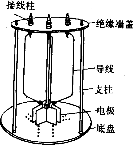 图1 静止式电极热水器内部结构 静止式电极热水器(图1),热水器的容器内壁用薄金属板或木材制成,外壁一律用木材制成,内外壁之间填充绝热材料。内壁用木材制成时,电极板联接方式为三角形;内壁用金属板制成时,电极板联接方式为星形-三角形。 流动式电极热水器(图2),热水器的外壳是普通水管,电极为圆形铁棒,固定在绝缘瓷瓶上,装于外壳内,并与之保持同心。为保证供电线路电压平衡,多用联成星形的三相热水器。
