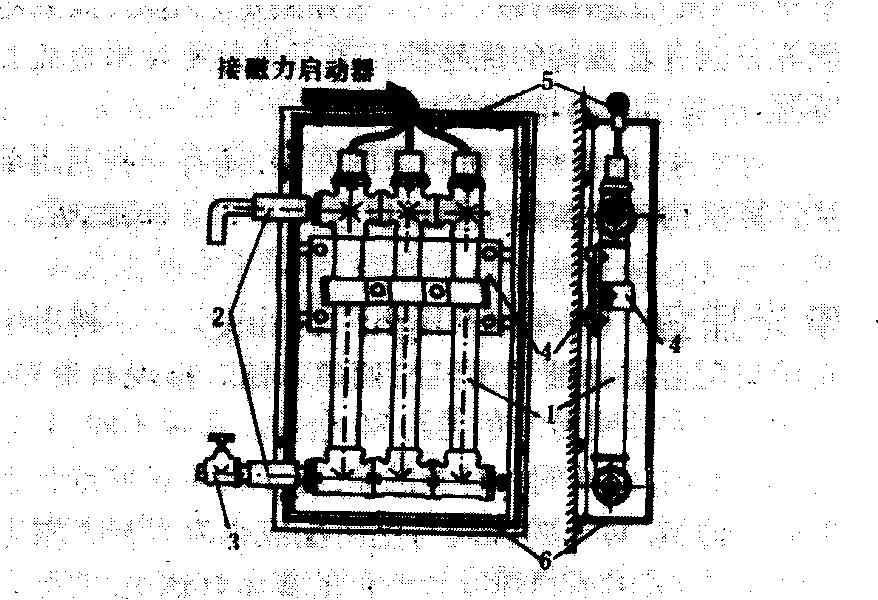 图2 流动式电极热水器结构示意 1.电极外壳;2.橡皮绝缘管;3.进水阀;4.绝缘支柱;5.导线;6.绝缘外罩 热水器中的水既是被加热物质,亦是电极间通电流的导体,而它的电阻系数是随温度而变化的。因此,静止式电极热水器在加热过程中,其功率随温度而变化。为使之在加温始终功率保持一致,可采用分级式电极,当水温达到某预定值时,自动切除一级。切除的约束条件为:❶各级切除时热水器所需功率相同,等于只余一级升到终温时所需功率; ❷切除每级时的水温,等于相邻一级切除时的水温与其始温之差的1/2。 流动式电极热水器的水温虽因流程而不同,但它的功率是恒定的。 电极式热水器使用时,进水管、用水管应加装1米以上橡皮绝缘管,用水阀需妥善接地或接零。 |