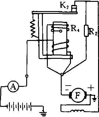 释义 | 电流限制器current limiter又称限流器。控制发电机最大输出电流,防止发电机过载的装置。是直流发电机调节器组成部分之一。由铁芯、电流线圈、触点、弹簧和附加电阻等组成。电流线圈串联在发电机电路上。当发电机负载过大,输出电流超过规定值时,电流线圈中通过的电流使铁芯产生的磁力增大,将触点打开。附加电阻接入激磁电路中,使发电机磁场强度减弱,电压下降,从而发电机电流也降低。流经电流线圈的电流减小,铁芯吸力减弱,弹簧的拉力使触点又闭合,附加电阻被短路,激磁电流增大,电压又回升,输出电流相应增大。当电流超过规定值时,触点又打开。触点时开时闭,将发电机输出电流限制在规定范围内。 电流限制器示意图 R4—平衡电阻(1Ω) R2—附加电阻(30Ω) |