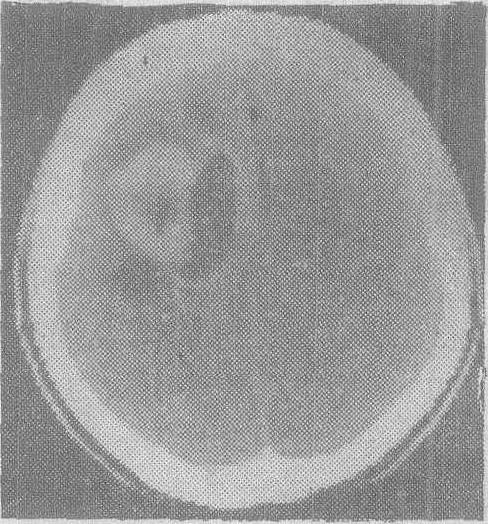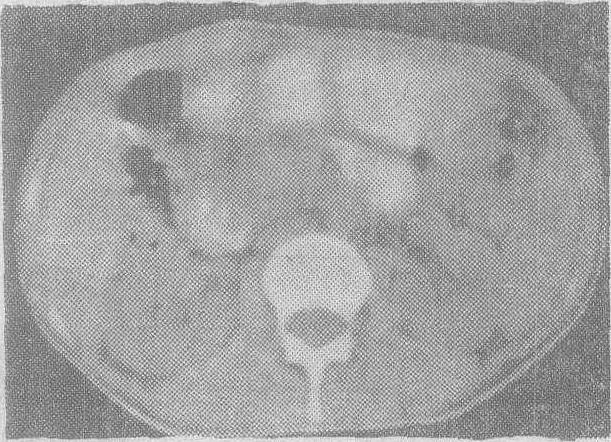 图1 脑转移癌,单发,左额,顶叶。CT扫描见左额、顶叶深部有不规则肿块,有造影剂增强。手术大部切除,病理诊断为转移腺癌,左额、顶叶深部(病人患左肺癌手术后5年) 腹部CT扫描 腹部肿瘤的早期诊断颇为困难,CT可以显示腹部脏器的解剖和密度,发现较小的瘤灶,并可同时发现几个脏器的病变。CT能发现小达2厘米左右的小肝癌灶。肝细胞癌的CT表现主要为肝内低密度区和突出肝轮廓外的瘤块。胰腺是最难检查的器官,近年采用超声扫描和CT取得较大的进展。CT扫描可显示胰腺的全貌,胰腺局部不成比例增大是胰腺肿瘤诊断的主要依据,其次为肿瘤压迫周围器官所引起的间接改变(图2)。胰腺肿瘤诊断准确率达87%。CT对发现肾占位病变效果较好,能够发现临床检查阴性、静脉肾盂造影正常表现的肾肿瘤,CT诊断肾囊肿的准确率达100%。腹膜后肿瘤特别是恶性淋巴瘤侵犯腹膜后淋巴结,CT扫描能显示瘤块范围,并能显示肿大的肠系膜淋巴结。
