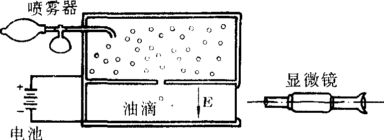 富兰克林时代,电荷被设想成连续的流体。直至1911年R.A.密立根通过油滴实验测得所有油滴所带电荷都是基元电荷e的整数倍,而得出电荷量子化的概念。密立根油滴实验装置如下图所示,一个很小的带电油滴在电场E内,调节E,使作用在油滴上的电场力与油滴的重量平衡从而测得该油滴电荷。然后换一个带电油滴再进行测量。由已知油的密度,例如为0.851克/厘米3,测得油滴的半径,密立根测量油滴半径的方法是,撤去电场,由观测油滴在空气中降落的极限速度去计算得到,例如为1.64×10-4厘米,就可得知油滴的质量和重量。测得平衡时的场强E=1.92×105牛/库仑,可计算出油滴电荷为8.204×10-19库仑。密立根是用一阵阵x射线照射油滴而使油滴带电的。早期密立根在一连串实验中所测得的不同单个油滴上呈现的电荷如下: