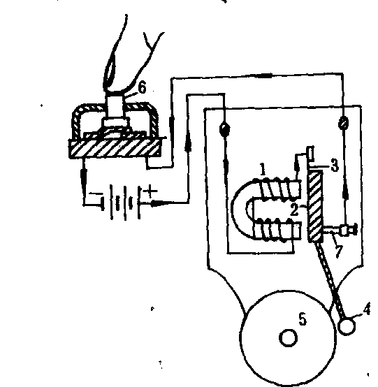 释义 | 电铃diàn líng利用电磁铁特性通电后使铃发出音响信号的装置。1901年《格物质学·Glossary》:“Electric chimes,电铃。”1903年关庚麟《日本学校图论》:“教授用品表: (博物)……电铃、摩儿斯印字机、受话器、微音送话器。” 电铃 电铃Dianling电流通过电磁铁产生周期性变化的磁力,从而吸引磁铁振动而使铃发声的一种装置。可分为直流电铃和交流电铃两种。直流电铃的构造见图,其工作原理是;按下电键时,电路接通,直流电通过断续器后再经过电磁铁的励磁线圈并产生忽通忽断的电流,从而使电磁铁具有时强时弱的磁性,对衔铁产生时有时无的磁力。当衔铁被电磁铁吸过去时,其下端的小锤就会在铃上敲一下;与此同时,电路被切断,电磁铁对衔铁的磁力即行消失,弹簧片随之反弹回去,并再次接通电路,又将衔铁吸引过去。如此反复循环,使衔铁振动而不断敲击铃,只要电键闭合,铃声就能响个不停。交流电铃的工作原理与之类似,当周期性变化的交流电通过电磁铁的励磁线圈时,将产生时强时弱的磁场,从而对衔铁产生时强时弱的磁力,使得衔铁往复振动而敲击铃使之发声。电铃可作为门铃、信号铃使用。 电铃构造困 1.U形电磁铁 2.衔铁3.弹簧片 4.小锤5.铃 6. 电键7.调节螺丝 ☚ 电磁铁 电磁波 ☛ 电铃electric bell |