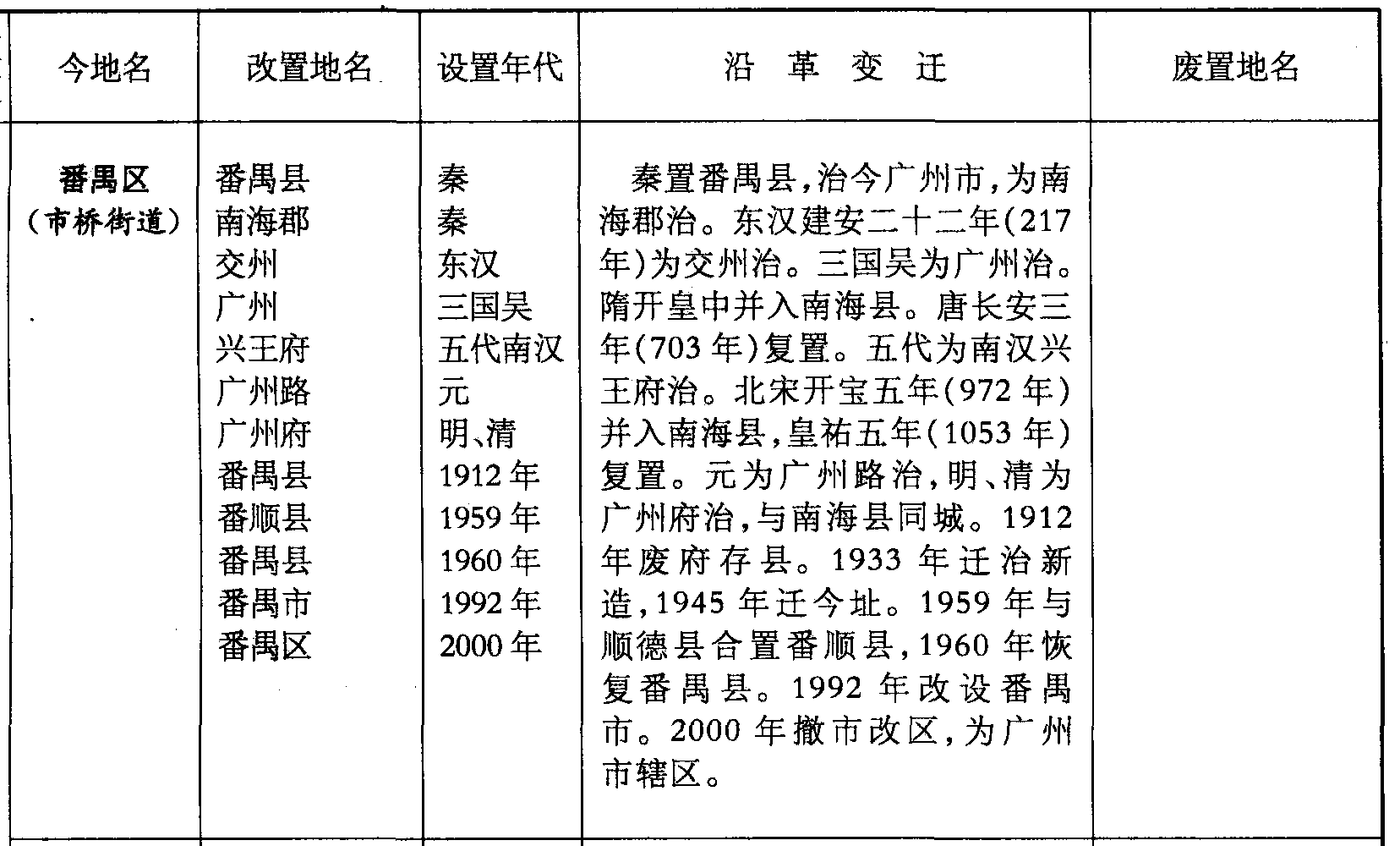 秦置番禺县,治今广州市,为南海郡治。东汉建安二十二年(217年)为交州治。三国吴为广州治。隋开皇中并入南海县。唐长安三年(703年)复置。五代为南汉兴王府治。北宋开宝五年(972年)并入南海县,皇祐五年(1053年)复置。元为广州路治,明、清为广州府治,与南海县同城。1912年废府存县。1933年迁治新造,1945年迁今址。1959年与顺德县合置番顺县,1960年恢复番禺县。1992年改设番禺市。2000年撤市改区,为广州市辖区。