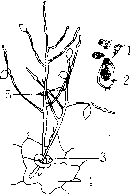 释义 | 疫霉属Phytophthora鞭毛菌亚门,霜霉目。菌丝体繁茂,丝棉状。菌丝分枝多呈直角,常在分枝处缢缩,局部膨大或形成多球形,无色至暗色,顶生或间生的厚壁孢子。孢囊梗与菌丝形态差异不明显或明显,单枝、不规则分枝或合轴分枝,无限生长;孢子囊多顶生,偶有间生,卵形、梨形、椭圆形和不规则形,有或无乳突,脱落或不脱落,脱落的孢子囊有柄,萌发产生游动孢子或芽管,一些水生菌的孢子囊有层出现象。藏卵器球形或近球形,器壁薄或厚,平滑或有纹饰,无色或黄色至褐色;雄器大小和形态不一,可分枝,无色,侧生或围生;卵孢子球形,壁厚或薄,无色至黄色,满器或不满器。本属菌大多数陆生,寄生性强,寄主范围常较狭窄。常见的有致病疫霉〔P. infestans (Mont.) de Bary〕,引致马铃薯晚疫病,烟草疫霉(P.nicotianae Bre-da.),引致烟草黑胫病。 疫霉属 1. 游动孢子 2. 孢子囊 3. 气孔 4. 寄主细胞 5. 孢囊梗 |