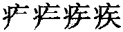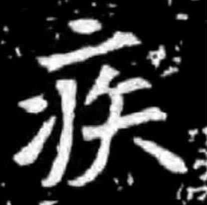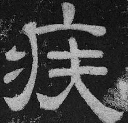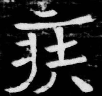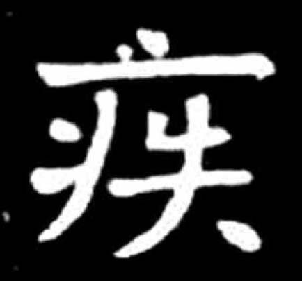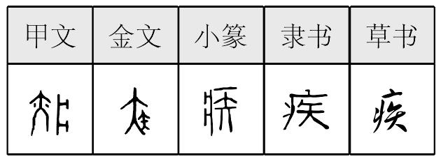 ❹ 不徐不疾|沉疴宿疾|吊丧问疾|膏肓之疾|含垢藏疾|积劳成疾|积忧成疾|疥癞之疾|疥癣之疾|马迟枚疾|纳污藏疾|忍垢藏疾|纤芥之疾|癣疥之疾|眼乖手疾|忧愤成疾|忧劳成疾 疾疾,甲骨文作        ,金文作   (摹本) ,《説文》籀文作 ,古文作 ,小篆作 。 甲骨文基本字形从爿从人會意。“爿” 即古 “牀” 字,人旁或加數個小點,表示人有病躺在牀上出汗。第三字形增从宀,表示在室中。第四字形从爿从大,从大與从人表意相同。第五、六、七字形是其省體。第八、九字形是其異體,構形从矢,當是以箭傷人會意,从大从矢,矢亦聲。金文第一字形與甲骨文第一字形相同。戰國金文人形與爿形相叠而成 “疒”(nè)形,故第二、三、四、五、六字从疒从矢,矢亦聲,或説从疒,矢聲。末字與甲骨文第八、九字形相同。據簡體字形隸定作 “疒”,據繁體字形隸定作“疾”。本義是疾病,引申爲禍害、疾苦、毛病、缺點、嫉恨、疾速等義。古代文獻一般把病情較輕的病叫 “疾”,病情較重的則稱爲 “病”。卜辭或用疾病義,或用疾速、緊急義。銘文或用疾速、緊急義,或用作人名。 楚簡帛文作  ,沿襲古體。秦簡牘文作 ,古隸典型。 疾jí会意字,“矢”为箭,意为因中箭而引发的病痛。因为中箭得病其速甚快,引申为快速。“草枯鹰眼疾,雪尽马蹄轻。”(唐·王维《观猎》)作声符生成的字有: jí 嫉(嫉妒) 蒺(蒺藜) 疾jí(10画)