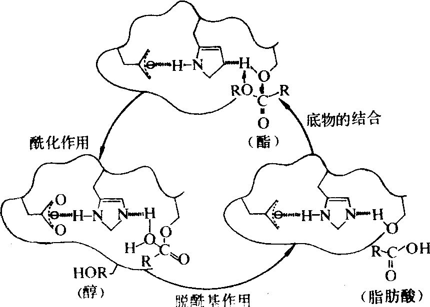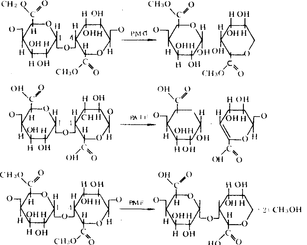 果胶酶 包括一组能对果胶分子中鼠李半乳糖醛酸链产生作用的酶类,通常分为两类: ❶果胶甲基酯酶(pectin methyleste rase), ❷果胶水解酶(pectichydrolases)和果胶裂解酶(pectic lyases)(图2)。作用是从果胶质中除去甲基基团以产生果胶酸。作用方式是在糖C6部位的羧基处水解每 一个α-1,4连接的半乳糖醛残基产生一个糖醛酸羧基和甲醇。 图2 几种果胶酶的作用机制