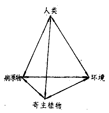 释义 | 病害四面体plant disease pyramid简单地表示寄主、病原物、环境和人类活动诸要素间复杂关系的三维几何模型。底面为病害三角,其三个顶点分别代表寄主植物、病原物和环境因子,病害四面体的另一顶点代表人类活动。这一模型着重反映在农业生态系统中人类的农业生产和病害管理活动对病害三角诸因素及其相互关系的重要作用和病害流行对人类社会的影响。植物病害流行学必须研究这种相互依存、相互影响的关系,从而充分调动人的积极因素,达到控制植物病害的目的。 病害四面体 |
