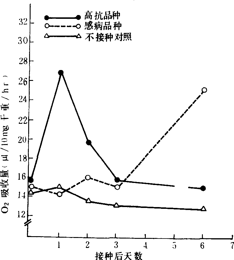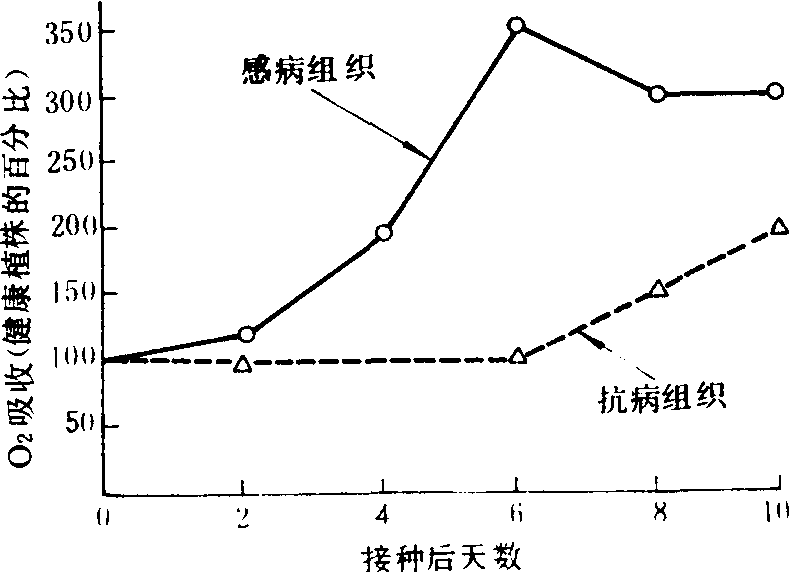感病品种呼吸速率迅速升高的现象如烟草青枯病中,抗病品种Coker139的组织摄氧量在侵染后第8天上升为对照的150%,而感病品种Bottom Special第2天即开始升高,第6天升至对照的350%(图2)。 呼吸速率降低 一般发现于感病植物中。如土耳其烟草受烟草花叶病毒侵染后呼吸速率下降。也有认为感病植物呼吸率升高与其计算方法有关。如感病烟草品种受烟草花叶病毒侵染后,若以单位鲜重CO2释放量计算,则病组织呼吸速率显著高于健康组织。由于病毒侵染使病组织水分丧失,因此应以干重计算更为合理,这样计算病组织呼吸率比健康组织略低。番茄受烟草花叶病毒奥古巴株系侵染后,以组织鲜重计算,则矮化病茎的呼吸速率高于健康组织; 若以节间耗氧量计算,病节间(与健康节间的细胞数目相等)呼吸速率显著低于对照。
