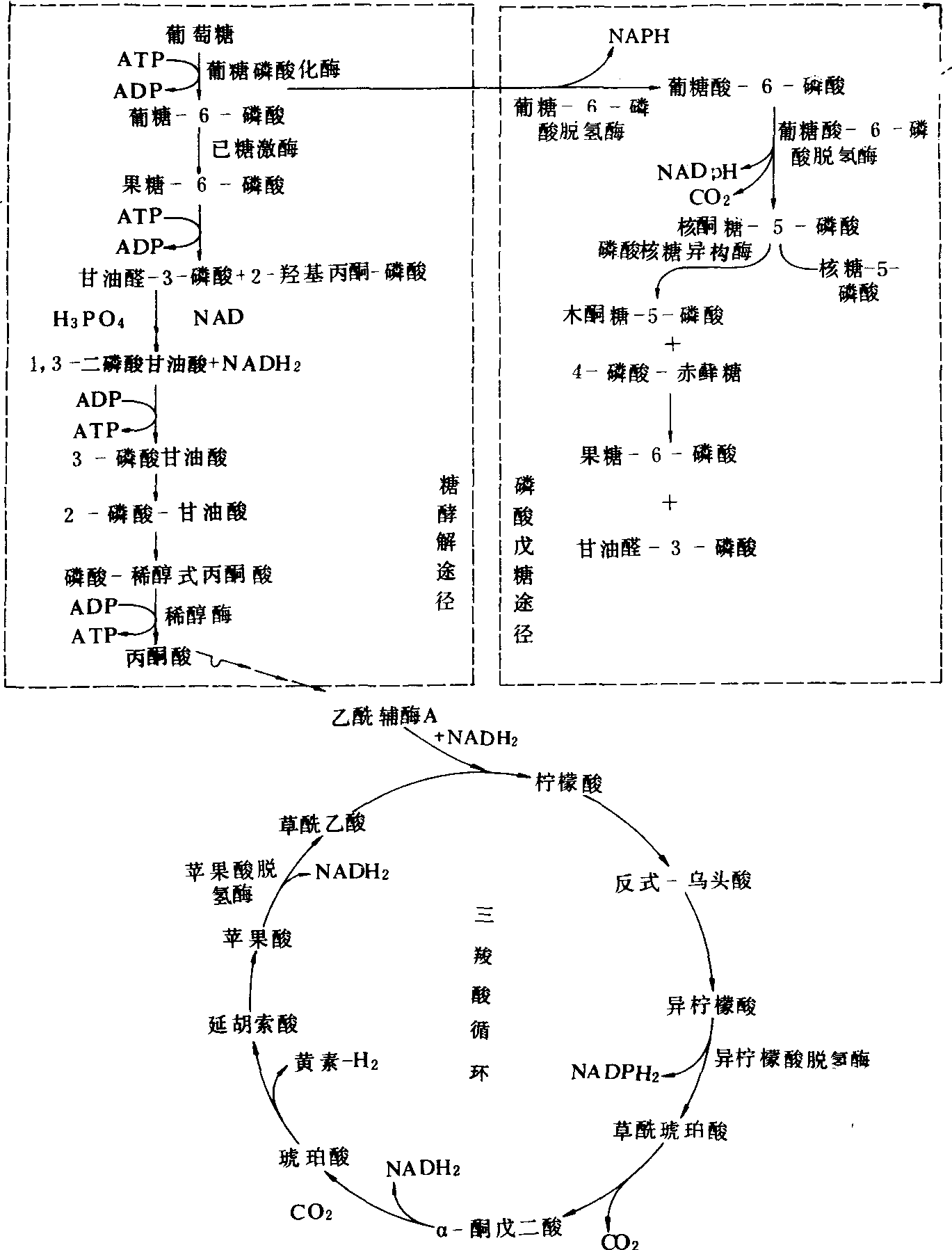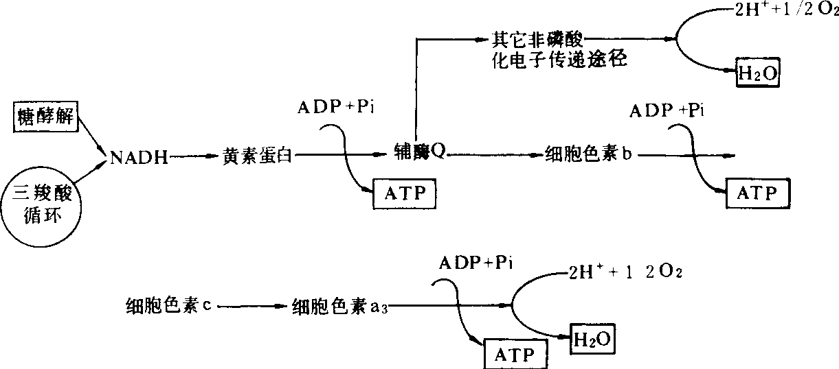 呼吸速率升高机制 病组织中呼吸速率升高是寄主本身的作用或病原物生长繁殖引起的,或二者共同作用所致。植物本身呼吸作用增强的机制主要是氧化磷酸化作用解偶联、生物合成加强、细胞膜透性改变等。 氧化磷酸化作用解偶联碳水化合物只氧化,而不形成ATP,导致ADP和无机磷酸增多,通过植物自身的调控机制而使呼吸增强。如小麦抗锈品种在整个病程中及感病品种的病程后期呼吸速率升高,组织中无机磷酸增多,ATP减少,对氧化磷酸化解偶联剂2,4-二硝基酚变得不敏感。 生物合成加强 植物对病原物的主动反应过程中木栓质、愈伤组织、胼胝质等的形成,植物保卫素等次生抗菌物质的合成,均需要呼吸作用提供各种碳架,同时大量消耗ATP、NADPH等高能化合物,导致ADP浓度增加,从而导致呼吸作用增强。 细胞膜透性改变 病原物产生的毒素、酶及激发子等,作用于植物细胞后使细胞透性增强,酶与底物的分室效应丧失,呼吸增强。如HMT毒素作用于感病玉米后线粒体膜透性增大,NAD易于透过,氧化作用增强。 呼吸途径变化 伴随呼吸速率的升高,病植物中不同呼吸途径发生特定的变化。 磷酸戊糖途径激活 是大多数病害中呼吸作用特征。有以下几方面证据:❶植物无氧和有氧呼吸的CO2比值小于理论值0.33。如红花下胚轴受红花柄锈菌侵染后二者比值为0.23。 ❷呼吸商小于1。如根癌土壤杆菌引起的甜菜块茎肿瘤组织的呼吸商为0.92,表明组织中脂类的β-氧化作用减弱。 ❸C6/C1值变小。在磷酸戊糖途径中,葡萄糖的C1碳原子主要以CO2形式释放,因而C6/C1将小于1。如红花锈病、蚕豆锈病、小麦锈病等病组织的C6/C1均显著下降。大豆下胚轴受立枯丝核菌侵染后含菌丝病斑组织及不含菌丝的周围组织中C6/C1均下降,随病害发展C6/C1值升高,但仍低于对照组织。在大麦白粉病、小麦锈病和菜豆锈病中,C6/C1值减小的动态与呼吸作用升高相一致。 ❹磷酸戊糖途径有关酶活性增强。此途径糖代谢参与的酶与其它途径不同。如根癌土壤杆菌侵染甜菜块根组织中葡糖-6-磷酸脱氢酶、葡糖酸-6-磷酸脱氢酶和磷酸核糖异构酶活性比健康组织高2~3倍; 野火病菌(Pseudomonas tabaci)侵染的烟草叶片中晕圈组织的葡糖-6-磷酸脱氢酶活性比正常组织高2.5倍; 烟草花叶病毒侵染的三生烟中磷酸戊糖途径占总呼吸活性的比重提高,此途径的前2种酶活性比健组织强,而糖酵解途径的酶葡糖-磷酸化酶、己糖激酶和磷酸己糖异构酶活性无变化。 图3 植物呼吸途径及有关酶类示意图 糖酵解和三羧酸循环活性减弱 主要对有关酶抑制剂的反应迟钝和有关酶的活性减弱。 对酶抑制剂反应迟钝 用糖酵解和三羧酸循环特殊酶的抑制剂处理病组织,病组织的呼吸性质改变。如F-和CN-是糖酵解途径重要酶——烯醇化酶的抑制剂,红花下胚轴健康组织受NaF抑制率为50%,而受锈菌侵染后抑制率仅33%,表明病组织糖酵解作用减弱。丙二酸是三羧酸循环酶——琥珀酸脱氢酶的抑制剂,小麦锈病、芸薹属霜霉病组织中呼吸作用受丙二酸的抑制作用比健康组织显著下降,表明三羧酸循环活性减弱。 酶活性减弱 如根癌土壤杆菌引起的甜菜块根肿瘤组织中磷酸己糖异构酶、3-磷酸-甘油酸激酶和磷酸果糖激酶活性下降; 马铃薯L病毒等侵染马铃薯后与糖酵解途径有关的几种酶活性也下降。又如白肋烟受烟草花叶病毒侵染后虽然乌头酸酶和异柠檬酸脱氢酶活性升高,但苹果酸脱氢酶无变化; 根癌土壤杆菌引起的曼陀罗和胡萝卜肿瘤组织中与三羧酸循环有关的酶活性减弱。辅酶A的积累也证明三羧酸循环活性减弱。 磷酸戊糖途径激活机制 与植物防卫基因的表达及产物合成有关。苯丙烷类化合物及其衍生物如木质素、类黄酮、类异黄酮、香豆素、羟基肉桂酸酯等,它们直接或间接与植物抗病性有关,这些物质的前体——莽草酸是磷酸戊糖途径的中间产物——4-磷酸赤藓糖合成的。此外,磷酸戊糖途径产生的核糖为植物基因转录提供核糖骨架(图3)。 巴斯德效应丧失 植物被真菌、细菌侵染后呼吸速率降低,进一步导致呼吸速率升高。如根癌土壤杆菌引起甜菜根瘤组织、红花锈病组织的巴斯德效应(0.26)比健组织(0.62)显著下降。 图4 电子传递过程和氧化磷酸化作用示意图 电子传递和氧化磷酸化作用变化 糖酵解三羧酸循环产生的电子和氢,经一系列传递过程到分子氧,产生水,同时发生磷酸化作用产生ATP(图4)。病植物的这一过程发生不同的变化。 细胞色素系统加强 在专性或兼性寄生菌引起的感病反应的早期阶段,电子传递系统仍以细胞色素系统为主,但其活性增强。如红花下胚轴受锈菌侵染后,组织对细胞色素a3抑制剂叠氮化物或CO的敏感性提高,而光可逆转这种抑制作用,说明病组织电子传递系统活性增强。 细胞色素系统抑制 在抗病反应的全过程和感病反应的后期阶段,病植物电子传递的其它氧化酶系统被激活,细胞色素系统受抑制,电子传递从辅酶Q发生短路而传递给其它电子受体,这一过程中不发生磷酸化作用,组织中ADP/ATP值升高,主要用于氧化磷酸戊糖途径产生的NADPH。 抗坏血酸氧化酶系统 小麦锈病、稻瘟病等病害中,其电子传递过程是: NADPH→谷光甘肽→抗坏血酸还原酶→抗坏血酸氧化酶→O2 多酚氧化酶系统 镰刀菌、疫霉菌等引起的病害中,其电子传递过程是: NADPH→谷光甘肽→抗坏血酸→醌→多酚氧化酶→O2 其它氧化酶 主要有羟基