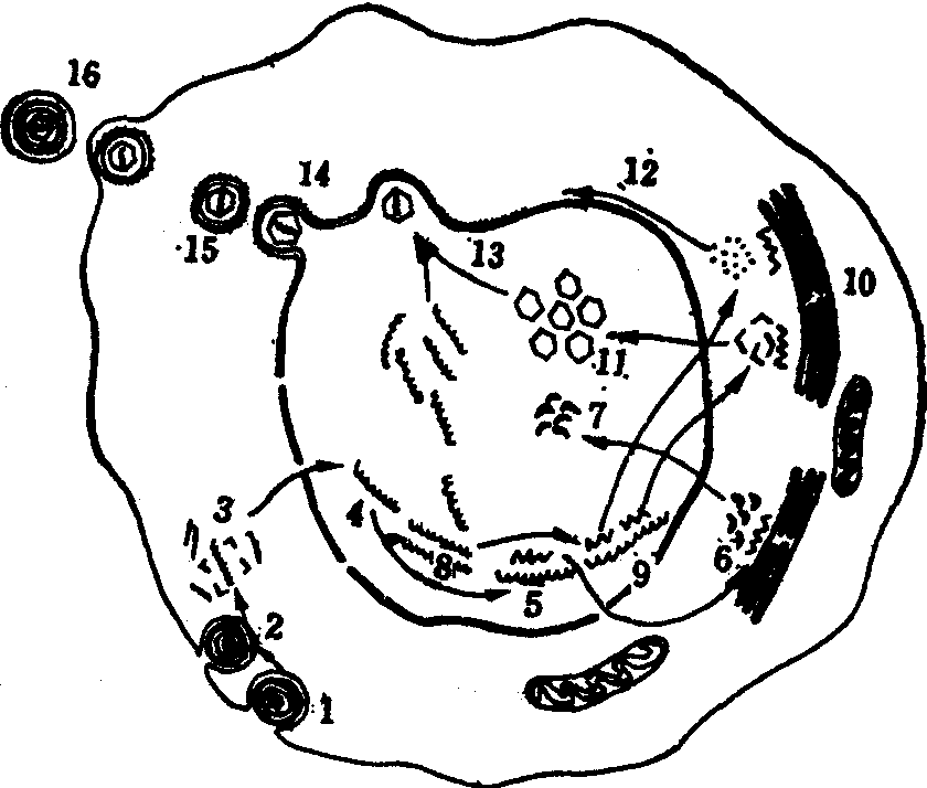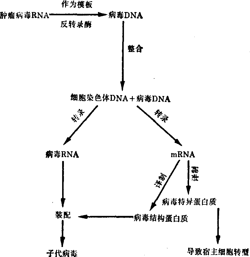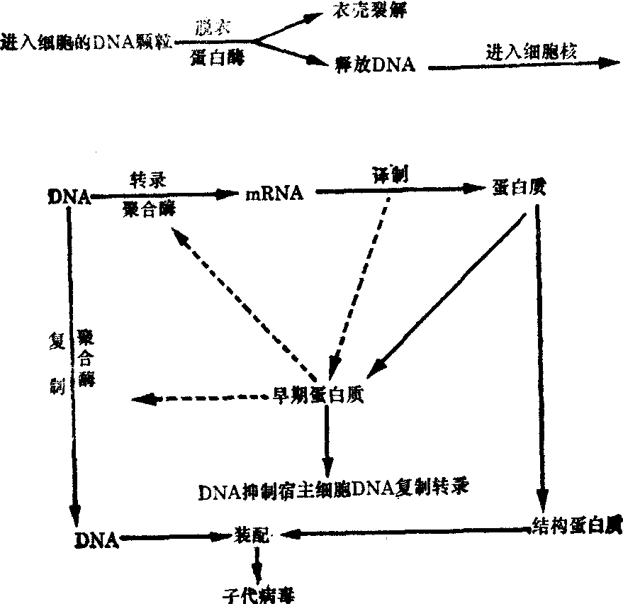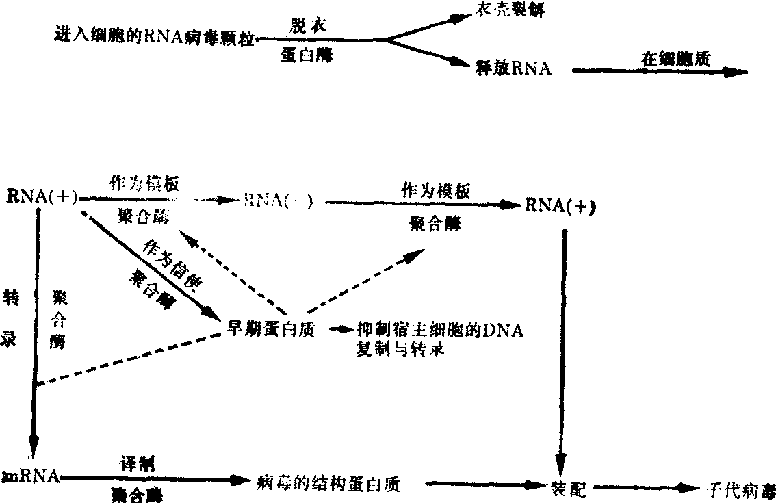 以上六组核酸类型的病毒,其复制的方法与过程显然是不相同的,表中仅选择最富代表性的双链DNA病毒、单链RNA病毒与单链RNA肿瘤病毒为例加以叙述。 当DNA病毒进入细胞蛋白衣壳裂解以后,被释放的DNA分子进入细胞核,在病毒DNA的指导下,利用宿主细胞的代谢系统首先翻译“早期蛋白质”,早期蛋白质的主要功能之一是关闭宿主细胞的基因调控、抑制宿主细胞本身的核酸复制与转录及蛋白质合成,另一种“早期蛋白质”可能是病毒特异性的聚合酶,在这些酶的催化作用下,以病毒DNA为模板,复制新的DNA,并转录带有病毒遗传信息的mRNA,mRNA与宿主细胞的核蛋白体相结合,按病毒的遗传信息,翻译病毒的结构蛋白质,这样就为子代病毒的装配准备了物质基础(图3)。 RNA病毒颗粒进入宿主细胞衣壳裂解以后,释放出病毒RNA。RNA分子本身首先可以作为mRNA,利用宿主细胞的代谢系统,翻译出“早期蛋白质”。这种早期蛋白质的功能与上述DNA病毒的“早期蛋白质”相同,一方面抑制宿主细胞DNA的复制与转录,同时在早期蛋白质提供的聚合酶的催化作用下,以病毒RNA分子自身作为模板,复制新的RNA分子,同时又转录mRNA,带有病毒遗传信息的mRNA与宿主细胞的核蛋白体相结合,翻译病毒的结构蛋白质,新复制的RNA与翻译的病毒蛋白质装配成子代病毒颗粒,以上的整个过程都在细胞质内进行(图4)。 凡是引起细胞转型的RNA肿瘤病毒,其复制过程与上述有根本的不同,当病毒进入细胞,衣壳裂解与释放RNA后,首先以病毒RNA分子为样板,在反转录酶(病毒自身所携带)的催化作用下,反转录出病毒的DNA分子,这种病毒DNA能与宿主细胞染色体的DNA链结合,称为整合,又以整合在细胞DNA上的病毒DNA为模板,转录新的病毒RNA与病毒mRNA,后者与核蛋白体结合,翻译出各种病毒蛋白质,其中包括病毒的结构蛋白质与导致宿主细胞转型的蛋白质,其结果,一方面是装配成新的子代病毒,另一方面导致细胞发生转型,转化为肿瘤细胞(图5)。 图3 DNA病毒复制的示意图 图4 RNA病毒复制示意图 由RNA作为模板反转录为DNA的过程是一个重大发现,而这一发现是在研究肿瘤RNA病毒与宿主细胞相互作用关系时取得的。 图5 DNA肿瘤病毒复制示意图 病毒的装配与成熟 病毒的装配与成熟是完成增殖的最后重要环节,病毒的核酸与蛋白质是在宿主细胞内分别合成的,两者装配成核衣壳,到目前为止,对动物病毒在宿主细胞内的装配过程及其机制还不很清楚。而抑制病毒的装配,可以导致病毒增殖的中断,这有助于对病毒的防治。实验资料说明,有些病毒(如小RNA病毒与腺病毒等) 的装配速度是很快的。装配过程与速率又受环境pH、温度、离子强度等因素的明显影响。病毒的装配也有相当的随机性,经常会发生 “错误”装配。常常可以发现没有核酸的衣壳从细胞释放,称为假病毒。有甲种病毒的核酸披着乙种病毒衣壳的现象。也有病毒衣壳内包含着宿主细胞的核酸,形成所谓伪病毒。装配好的小RNA病毒能在细胞质内形成整齐的晶格排列,而腺病毒与一些疱疹病毒经常在细胞核内呈晶格排列,晶格的形成与衣壳蛋白质的特性有关。 无囊膜的立体对称型病毒,当其核酸与蛋白质装配成核壳体时,就成为具有感染性的完整病毒粒子,对这些病毒来说。装配就是成熟。有囊膜的病毒,当其核酸与衣壳蛋白装配成核衣壳后要穿过细胞膜而释放,核衣壳外包上一层细胞膜而成为病毒的囊膜,囊膜实际上是特化的细胞膜,它上面具有病毒的特异蛋白质,如血凝素、神经氨酶以及其他抗原分子。有些装配好的病毒是在细胞质内向内质网空泡中释放,裹上一层内质网膜而成为囊膜。有些DNA病毒,如疱疹病毒的核衣壳是在细胞核内装配的,它的囊膜是由特化的核被膜形成。综上所述,对有囊膜的病毒来说,它们的成熟是与释放同时完成的,只有成熟的病毒才具有感染性(图6)。 图6 病毒(疱疹病毒)在细胞内增殖(复制过程示意图1. 病毒吸附在细胞膜上;2. 以吞饮方式病毒进入细胞;3. 病毒衣壳裂解释放出核酸;4. 病毒核酸(DNA)进入细胞质;5. 以病毒DNA为模板转录早期mRNA;6. mRNA进入细胞质,在粗面内质网上与核糖体结合,翻译出早期蛋白质;7.早期蛋白质抑制细胞DNA的复制与蛋白质的合成;8. 以病毒DNA为模板复制出新的病毒核酸,新复制的DNA贮存在核内;9. 以病毒DNA为模板转录后期mRNA;10. mRNA在内质网上与核糖体结合翻译出病毒的结构蛋白质、衣壳蛋白质与囊膜小体蛋白质; 11.衣壳蛋白质进入细胞核内;12.囊膜小体蛋白质附着在核被膜上; 13.病毒DNA与衣壳装配成核衣壳;14. 核衣壳穿过核被膜时披上由双层核被膜特化的囊膜;15.在细胞质中的新病毒颗粒;16. 病毒从细胞释放出来。 病毒向细胞外释放 许多无囊膜的病毒,如腺病毒、小RNA病毒、小DNA病毒以及痘病毒等,从细胞向外释放的速度很快,当病毒释放时,引起细胞膜的崩解。有囊膜的病毒是以出芽方式释放,是细胞膜外卸的一种方式,病毒是先后逐步释放的。 从病毒侵入细胞到子代病毒的成熟释放称为一个增殖周期(或复制周期),对不同的病毒,其增殖周期所需时间不一,小RNA病毒仅需约2h多,疱疹病毒约10—15h,腺病毒14—25 h,每一个细胞内能复制装配多少病毒?不同的病毒不一样。根据电镜观察统计,小RNA病毒、小DNA病毒与腺病毒在每个宿主细胞内能复制装配数以万计的病毒,当然应指出,并不是每颗病毒都有感染性,而疱疹病毒与粘液病毒在每
