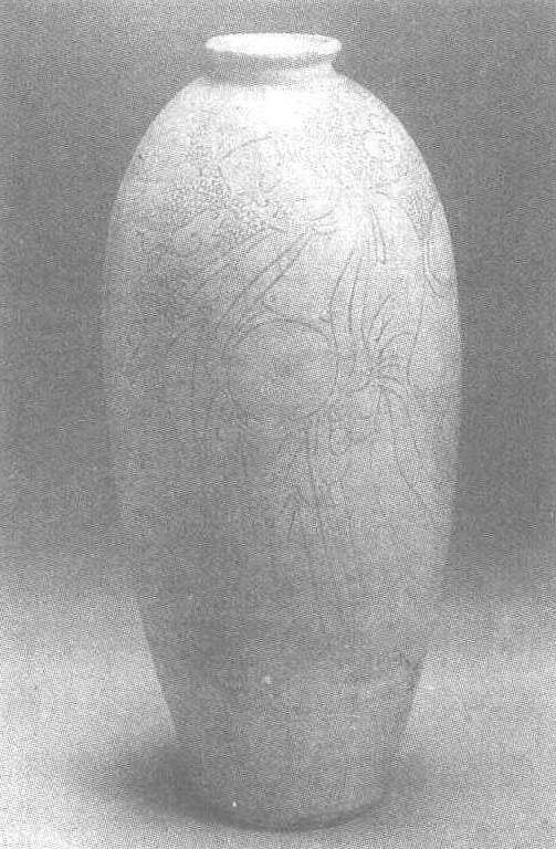 宋。高39.7厘米,口径7厘米。上海博物馆藏。河南省登封窑的珍珠地划花装饰在宋代民窑中较有名气。在主纹样的空隙处填以珍珠般的小圆圈纹,俗称珍珠地。此瓶纹饰是在珍珠地上刻划人物。一个戴幞头,穿长衫的汉子,双目微闭,头半垂,袒胸露腹,肩挑一葫芦,俨然一个醉汉。工匠仅用简单的线条即将人物的醉意朦胧、步履蹒跚之态刻画得惟妙惟肖,使人联想到梁山英雄大碗喝酒后的醉态。此外,人物头部周围的几朵云彩,是独出心裁之作,它生动地表现人物正处于云遮雾罩之中,以喻酒后的醉意。