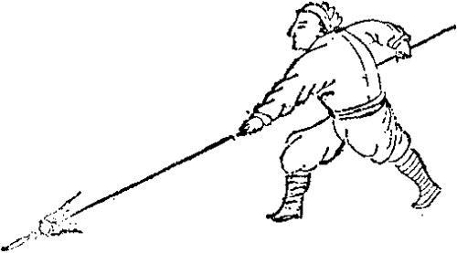 传统枪术动作。明戚继光《纪效新书》卷十载:“乃六封枪法,斜倒硬上如风,退闪提缠捉他如压卵,又朝天铁扫迎封接靠。”