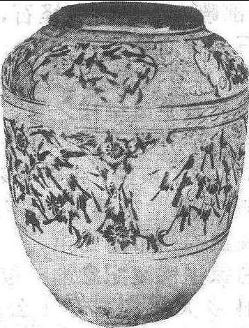 白地褐花大缸明代山西壶关县民窑产品。高82. 8、口径40、腹径67. 5厘米。直口圆沿、口沿为缸胎、圆肩直腹,下部微向内收、平底。釉面光亮略有淌釉、划点现象。浊乳白色地、褐色花纹,图案依据器物造型分为两组。一组绘于缸肩部、有五个开光画面,均以菊花为题材,间隔衬地有海浪纹、几何纹、花草纹等。另一组图案绘于腹部、有四个大的开光画面,以几枝由上向上延伸弯曲的菊花、枝叶布满、衬地亦作菊花装饰。两组开光之间有三条直线及两条波浪线相隔,形成曲直对比的效果。缸下部留有一段空白。肩部近口沿处的两条直线中间写有 “大明国山西口口口口口口器”等字,漏字部分因淌釉所致。其造型浑然洒脱、纹饰美观大方、运笔流畅、布局严谨。旅顺博物馆藏。